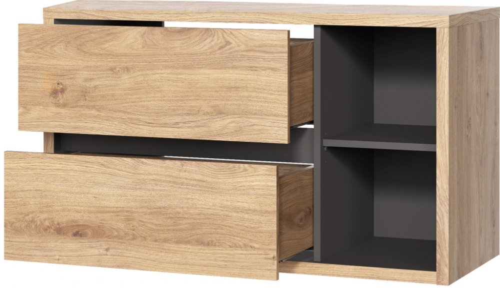 Skříňka pod umyvadlo Devon 100 cm vnese do koupelny moderní a elegantní styl. Jedná se o široký závěsný modul s nadčasovým designem, který kombinuje korpus v teplém dřevěném dekoru dub shetland s tmavými policemi v barvě grafit. Skříňka je určena pro instalaci umyvadla a nabízí velkorysý úložný prostor ve dvou prostorných zásuvkách.