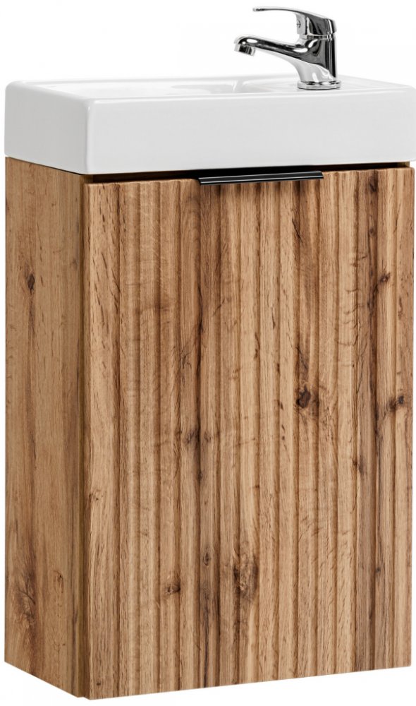 Sada se skládá ze skříňky pod umyvadlo Adel Oak a umyvadlové skříňky Vedea, které spolu tvoří harmonický a vizuálně vyvážený celek. Frézované svislé drážky na čelech dodávají nábytku charakter a jemný dekorativní detail, zatímco úchytky ve třech barevných variantách – lesklé zlato, lesklý chrom a matná černá – umožňují přizpůsobení celkového vzhledu podle stylu vaší koupelny.