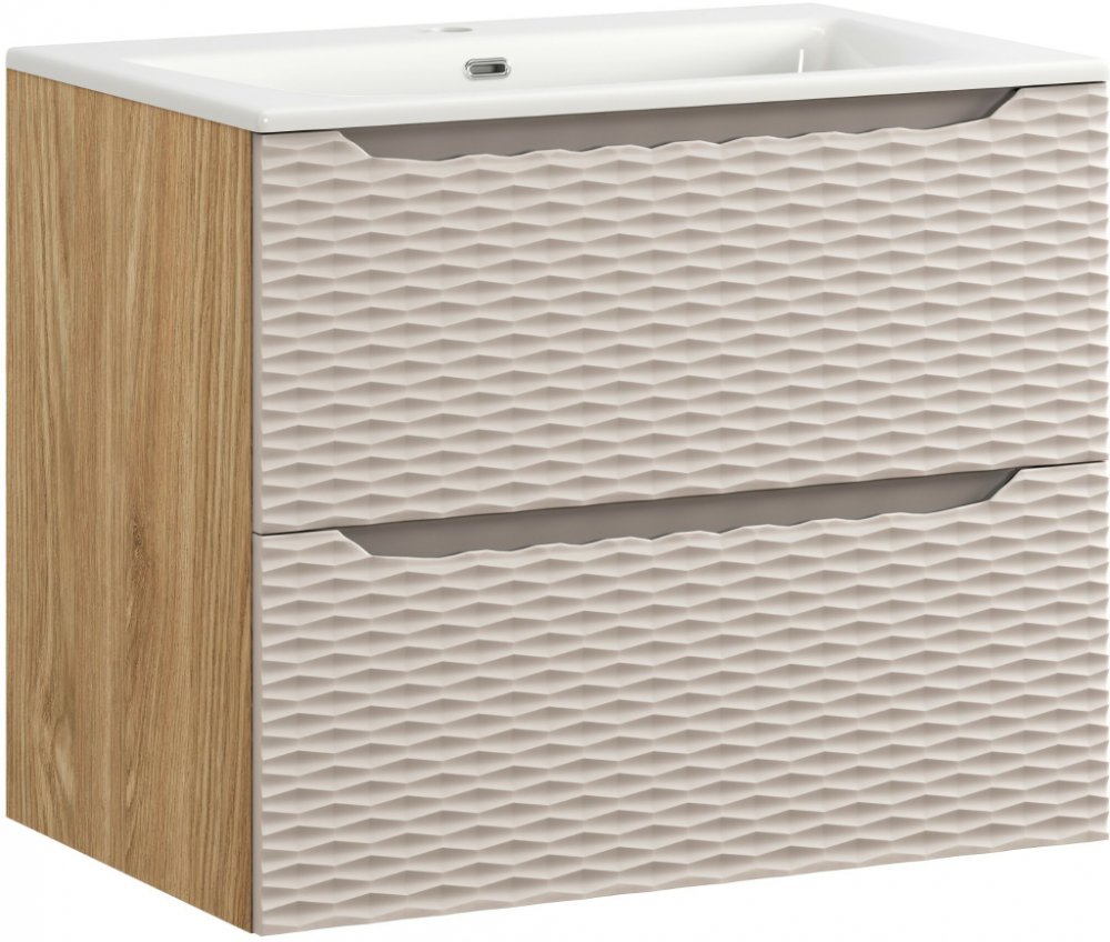 Tato umyvadlová skříňka z kolekce Ocean Beige přináší kombinaci moderní elegance a přírodního designu. Přední plochy v jemném béžovém dekoru s frézovaným vzorem dodávají nábytku stylový a originální vzhled, zatímco korpus v provedení dub olejovaný vnese do koupelny příjemné teplo a harmonii. Minimalistické a integrované úchytky podtrhují čistý a nadčasový design.