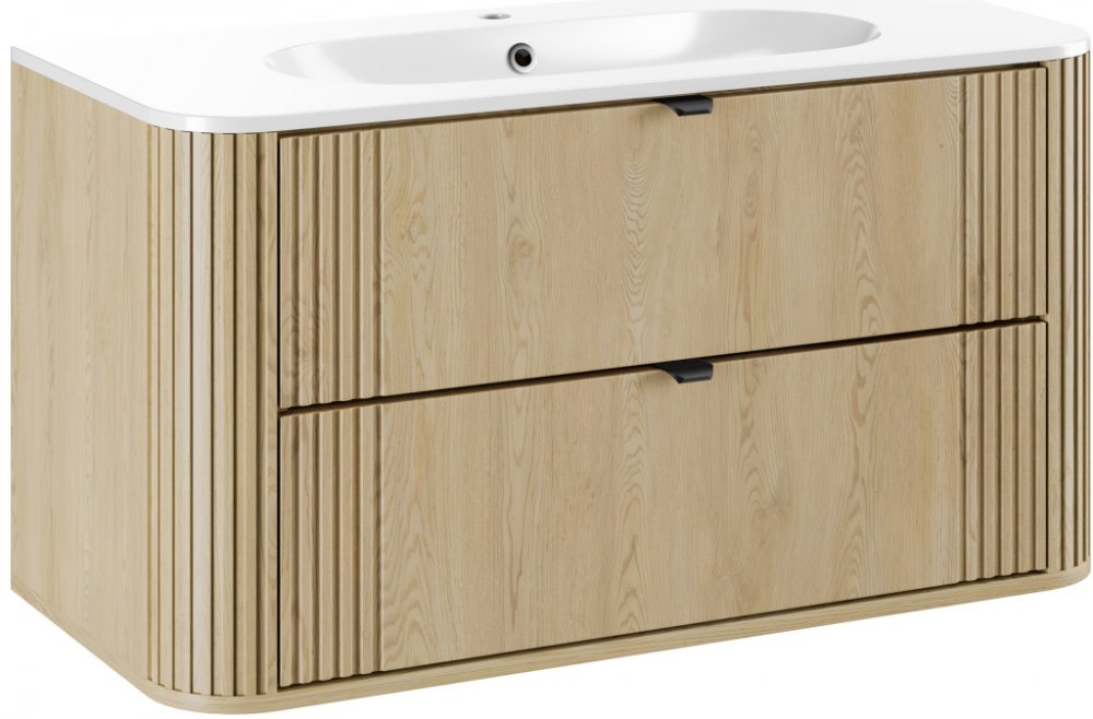 Skříňka pod umyvadlo o šířce 100 cm se dvěma zásuvkami z kolekce Ovalia Cremona je výrazným prvkem koupelny – jedinečné spojení jemnosti a charakteru, které okamžitě upoutá pozornost. Charakteristicky zaoblené rohy dodávají nábytku vizuální lehkost, zatímco výrazné svislé drážkování – umístěné po stranách čel i na zaobleních – podtrhuje jeho originální tvar. Teplý dekor dubu Cremona věrně napodobu...