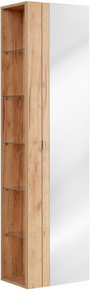 Prohlédněte si ostatní produkty z kolekce CAPRI. Koupelnová skříňka CAPRI má neobvykle řešený design. Na boku se nachází otevřené police z tvrzeného skla, které vybízí k umístění dekorací nebo předmětů, které chcete mít stále na očích a po ruce. Na druhé straně skříňky za uzavíratelnými dveřmi se nachází další police, které poskytují množství prostoru pro uložení potřebné kosmetiky, čisticích prostředků a podobně. Produkt má systém tlumeného zavírání, díky němuž je ještě praktičtější. Závěsná koupelnová skříňka má tělo vyrobené z laminované MDF desky a po celé výšce čela je zrcadlo. Specifikace produktu Postranní police z tvrzeného skla Systém tlumeného zavírání Tělo a přední strana z laminované MDF desky Moderní styl Rozměry Výška: 170 cm Šířka: 45 cm Hloubka: 33 cm Materiál Laminovaná MDF deska