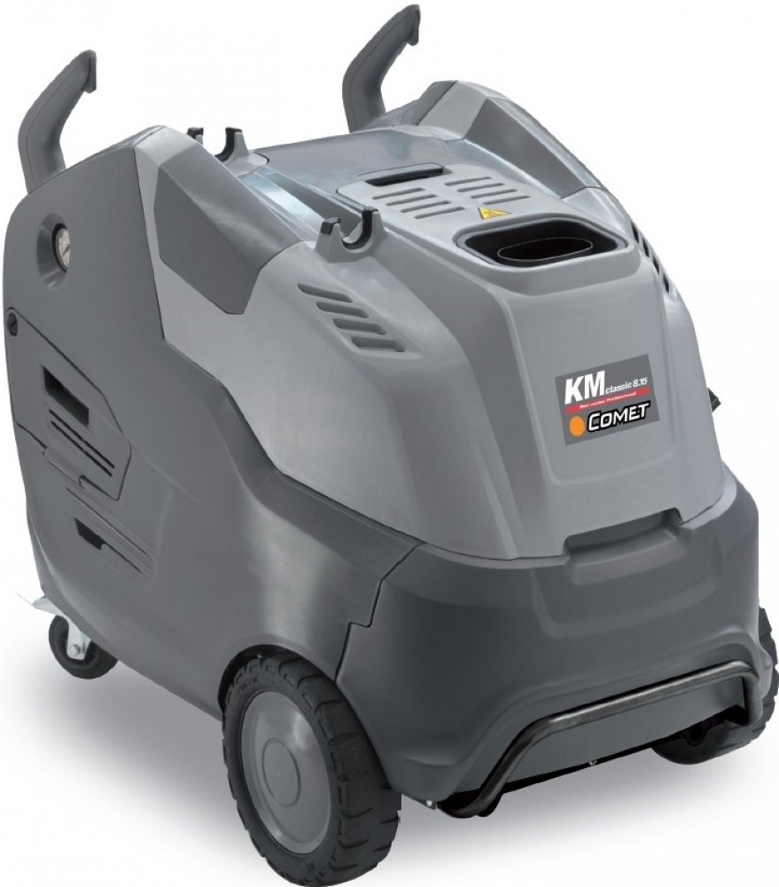 Comet KM Classic 8.16 Pofesionál vysokotlaký čistič s ohřevem vody. Wapka je vybavená samostatným ventilátrem pro spalování v kotli. Dobrá manipulace díky bočním dvířkům k nastavení tlaku a kontrolu filtrů. V přední části nahoře je víko, kryjící nádobu na čistící prostředek. Snadný přístup k přepravnímu háku, vybavení kovovým předním nárazníkem, dvěma velkými pevnými koly a dvěma otočnými