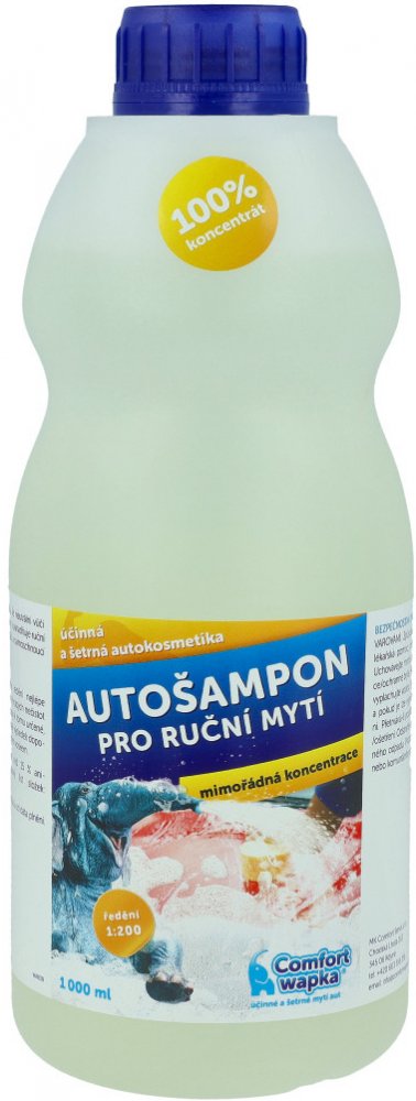 Comfort wapka – AUTOŠAMPON PRO RUČNÍ MYTÍ 1L je koncentrovaný prostředek pro ruční mytí automobilů a ostatních vozidel, který šetří vodu a usnadňuje mycí proces. Vytváří velké množství pěny s lubrikační funkcí, což pomáhá zabránit vláčení nečistot po karosérii během kontaktního mytí. Netvoří šmouhy na skle, neboť jeho složení neobsahuje vosky ani zvýrazňovače lesku. Vyniká kvalitou a rychlostí odstranění nečistot a k tomu má nadstandardní odmašťovací, samolešticí a samoschnoucí vlastnosti.