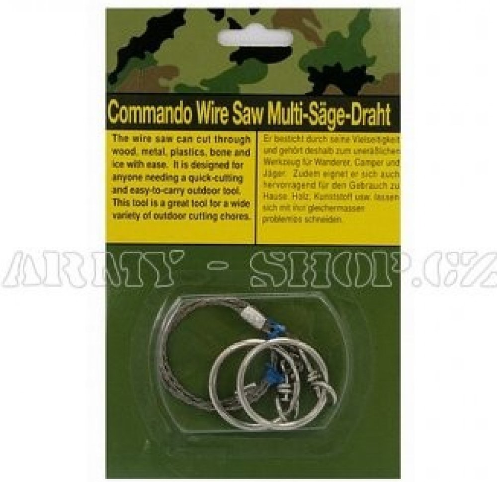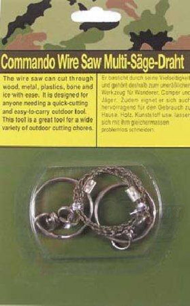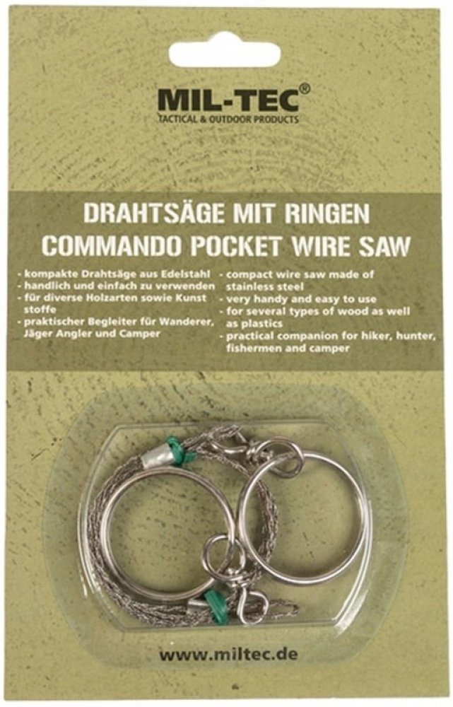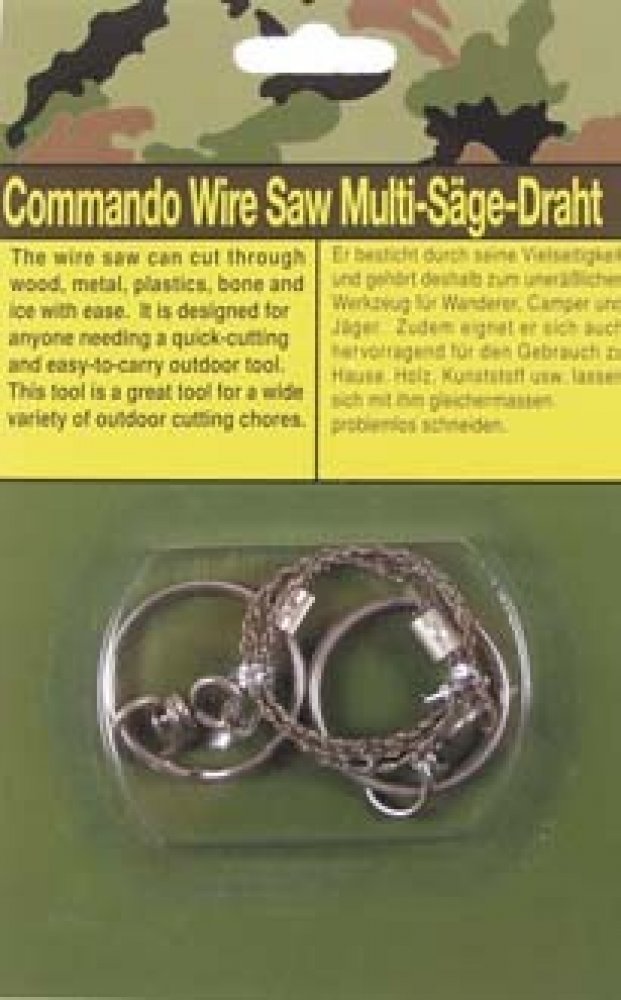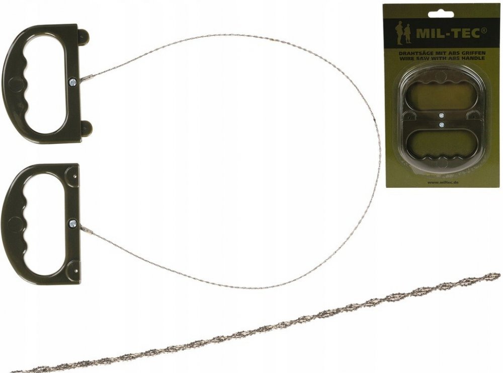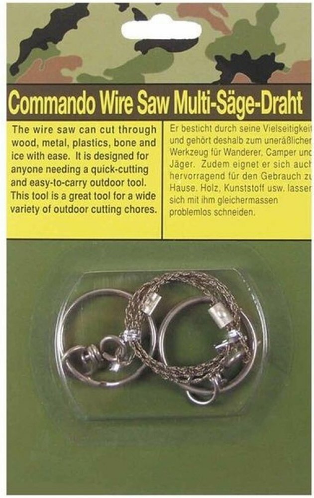 Drátová pilka určená od německé značky MFH. Při správné technice s ní lze přeřezat i poměrně silné kusy dřeva. Díky nízké hmotnosti ji lze nosit stočenou třeba v kapse či krabičce poslední záchrany bez nebezpečí zlomení pilky nebo úrazu. Vlastnosti: • 8násobný vinutý speciální drát • velmi pružná • velmi nízká hmotnost • neocenitelná při budování přístřešků, improvizovaných staveb a pastí