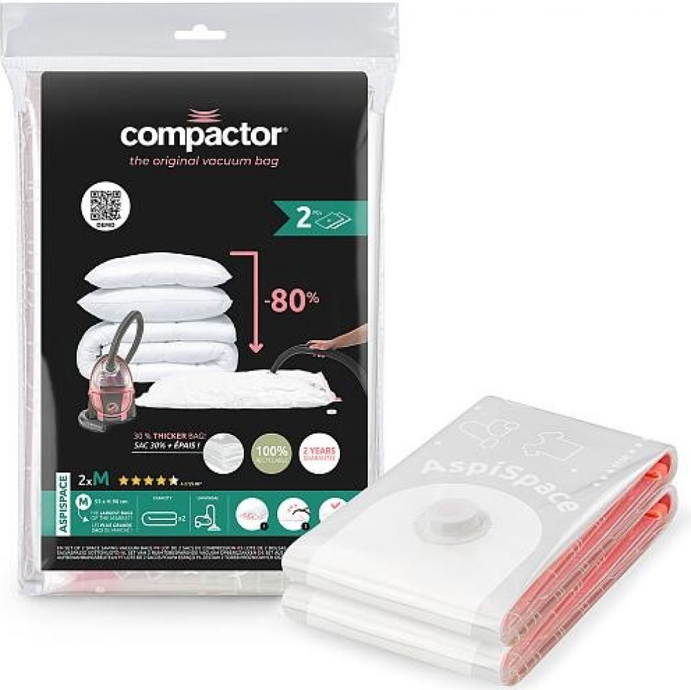 S úložnými vakuovými sáčky Compactor Aspispace dosáhnete opravdu maximální úspory místa, a to nejen doma, ale třeba i na cestách. Textilie uskladněné tímto způsobem ušetří 80 % prostoru (např. peřina o tloušťce 50 cm se ve vakuovém pytli po odsátí vzduchu zmenší na 15 cm). Pytle jsou vyrobeny z polymeru s tvarovou pamětí, proto se při opětovném vpuštění vzduchu vrátí do původního tvaru. Navíc se jedná o materiál, který nemění textilní vlákno, což v praxi znamená, že pokud do pytle vložíte vyprané a vyžehlené oblečení (doporučujeme), ve stejném stavu ho po dekompresi opět vyndáte. Sáčky jsou opakovatelně použitelné.