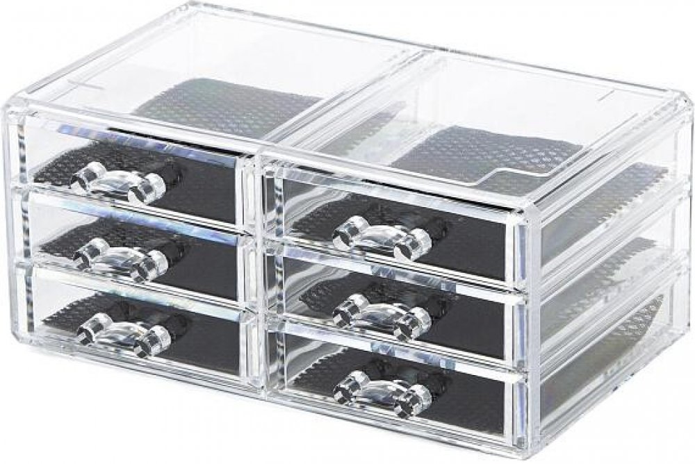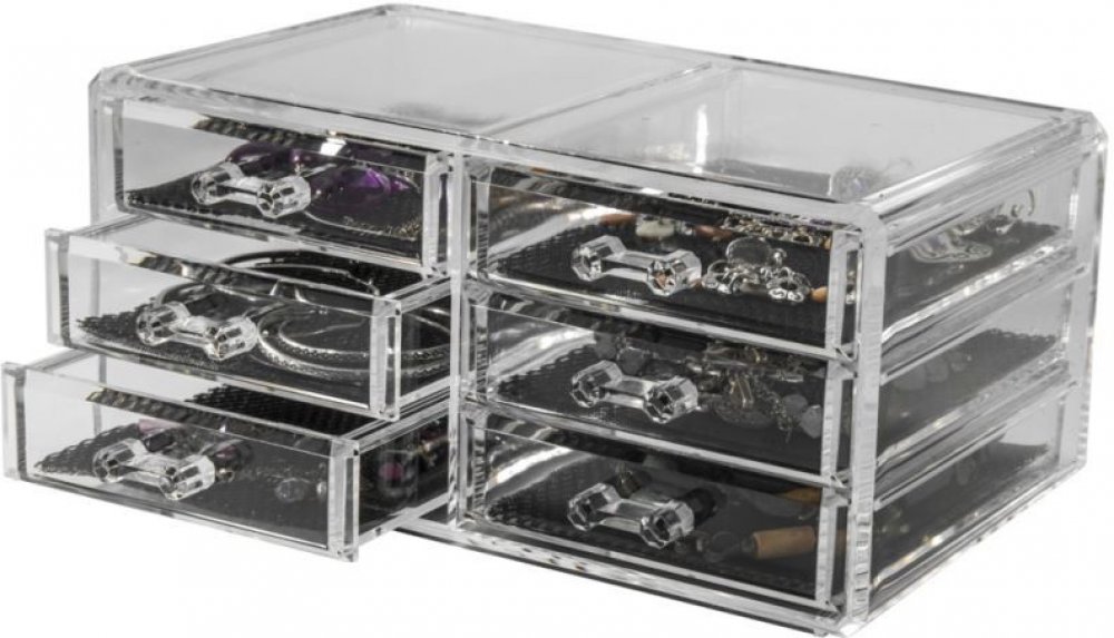 Prostorný organizér na šperky Compactor je vyroben z odolného čirého plastu. K dispozici je šest oddělených zásuvek, které poskytují dostatek místa pro umístění a přehledného roztřídění velkého množství šperků. Má rozměry 23,8 x 15 x 11 cm.