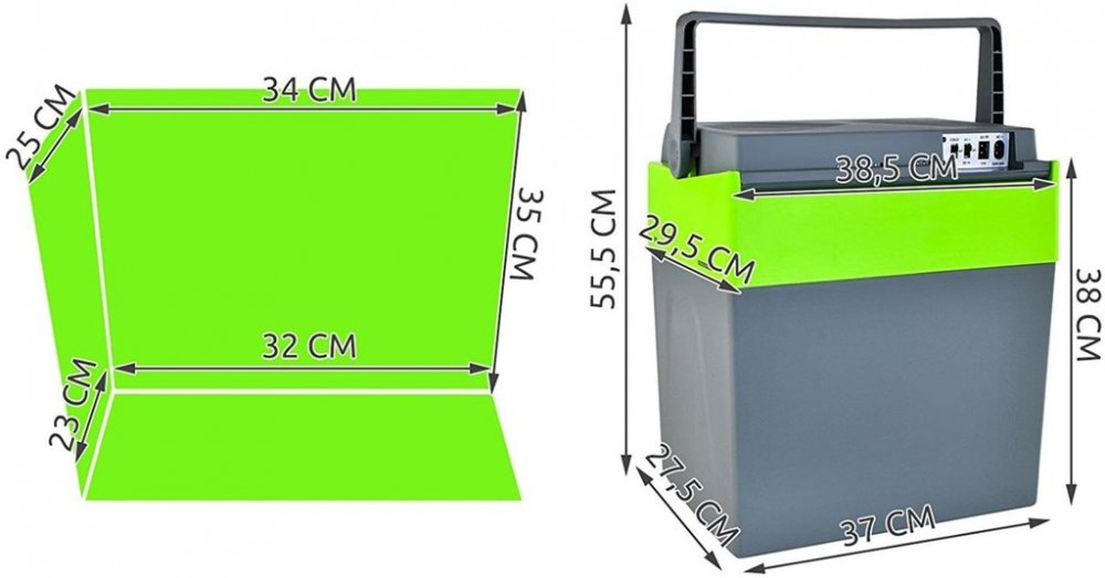 Přenosný chladicí box napájený z 12 V zásuvky autozapalovače, nebo 230 V z běžné zásuvky.