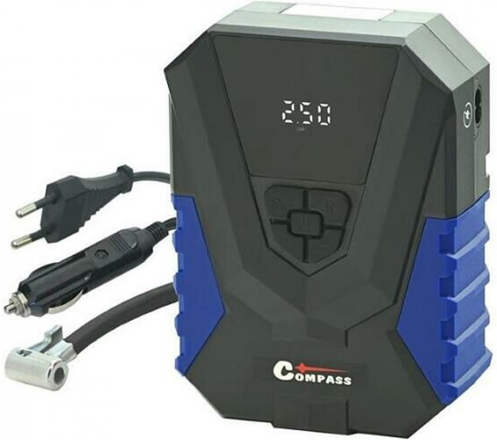 Výkonný vzduchový kompresor opatřený digitálním displejem s pneuměřičem a Auto-stop systémem pro huštění na předem nastavené hodnoty tlaku. Napájení pomocí dlouhého kabelu se zástrčkou do zásuvky automobilového zapalovače 12V, nebo napájecího kabelu pro přípojení do sítě 230V. Kompresor je vhodný k huštění pneumatik osobních automobilů, motocyklů či jízdních kol na předem nastavený tlak. Vzduchová hadice je ukryta ve spodní části zařízení a má délku 45 cm. Součástí balení jsou rovněž adaptéry pro další použití (huštění míčů, matrací, bazénů apod.) Displej zařízení umožňuje zobrazení naměřeného tlaku. Pomocí ovládacího panelu lze zvolit zobrazované jednotky (PSI / BAR / kPa / kg/cm2). Ovládací panel také umožňuje snadné nastavení hustícího tlaku. Čelní strana kompresoru je navíc opatřena LED osvětlením, doplněným o červené SOS světlo. Technická data DC napájení12 V / 10 A AC napájení230 V / 1 A Průtok vzduchu25 l / min Max. tlak150 PSI / 10,3 Bar Svítilna3x LED a 3x SOS LED délka hadice45 cm Kabel 12V290 cm Kabel 230V145 cm