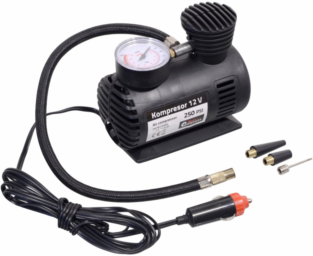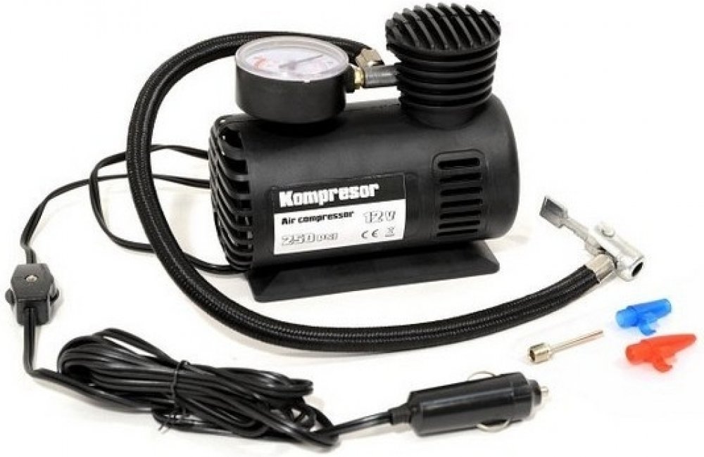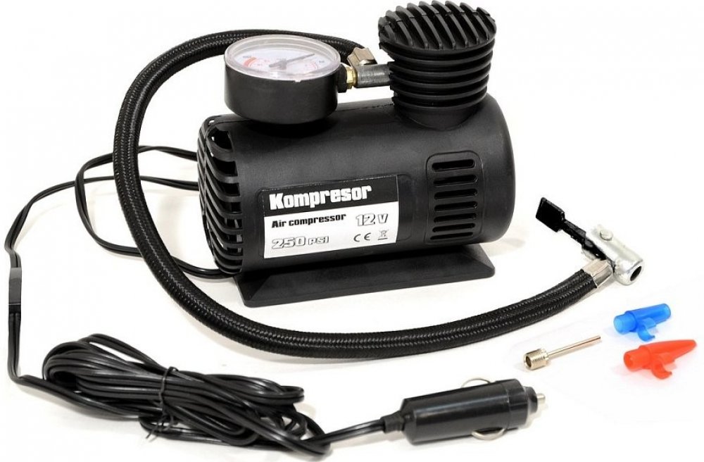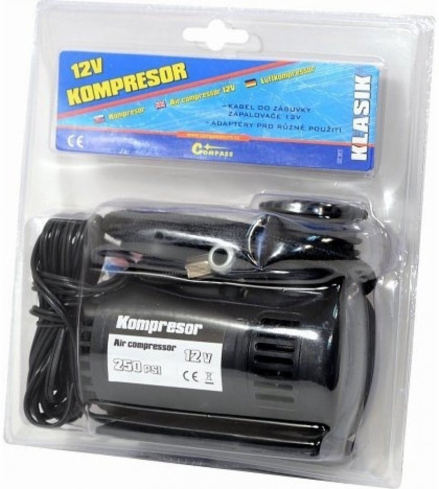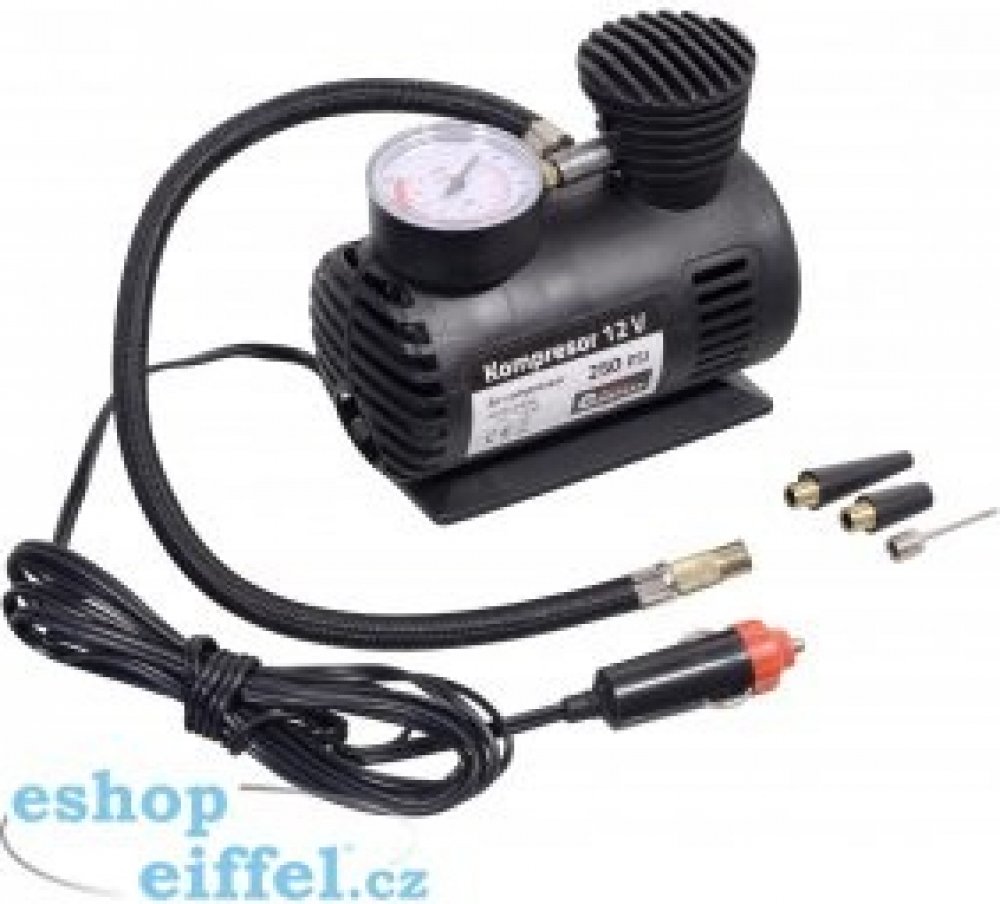Vzduchový kompresor vybavený měřičem tlaku s celokovovým adaptérem pro klasický autoventilek. Napájení 12V, kabel se zástrčkou do zásuvky automobilového zapalovače. Součástí balení jsou přídavné adaptéry pro huštění gumových matrací, míčů apod.