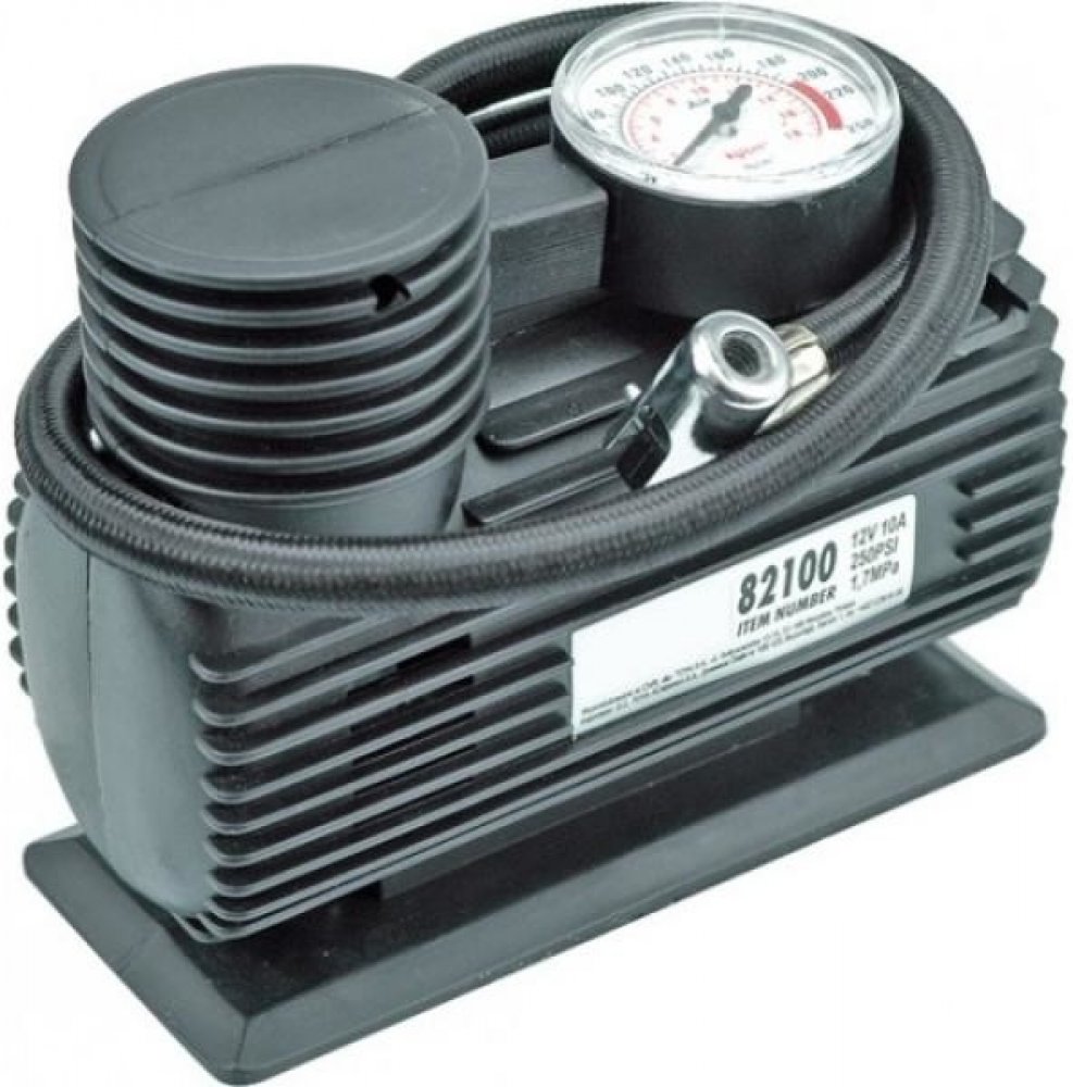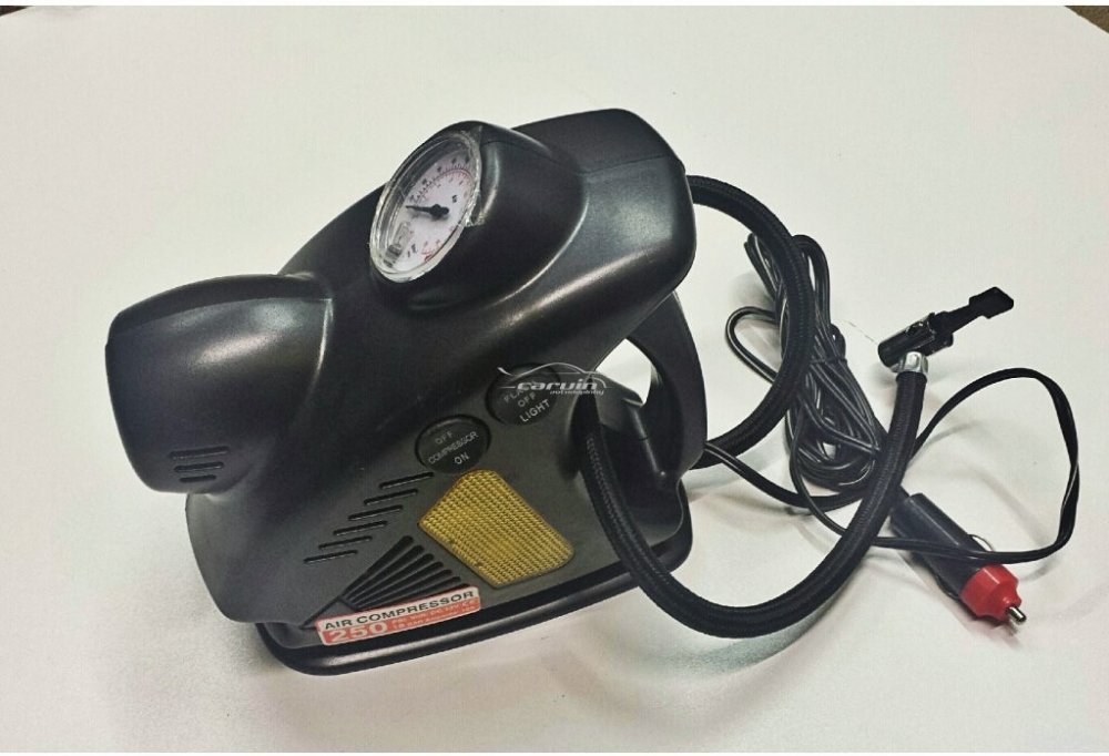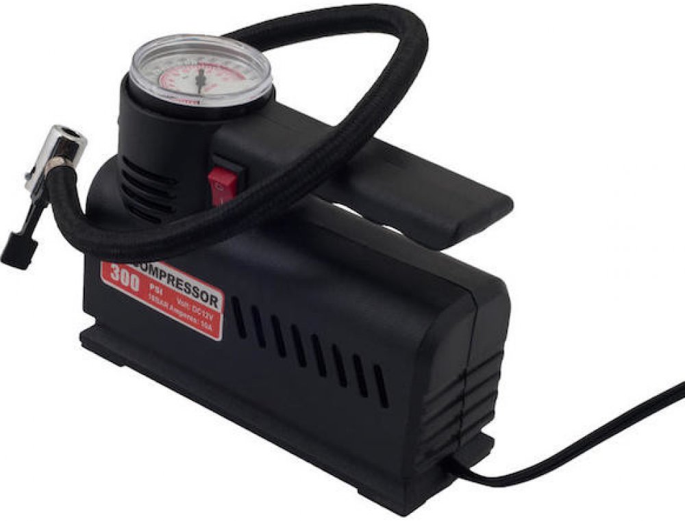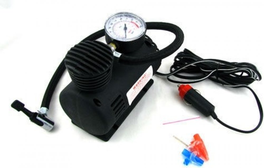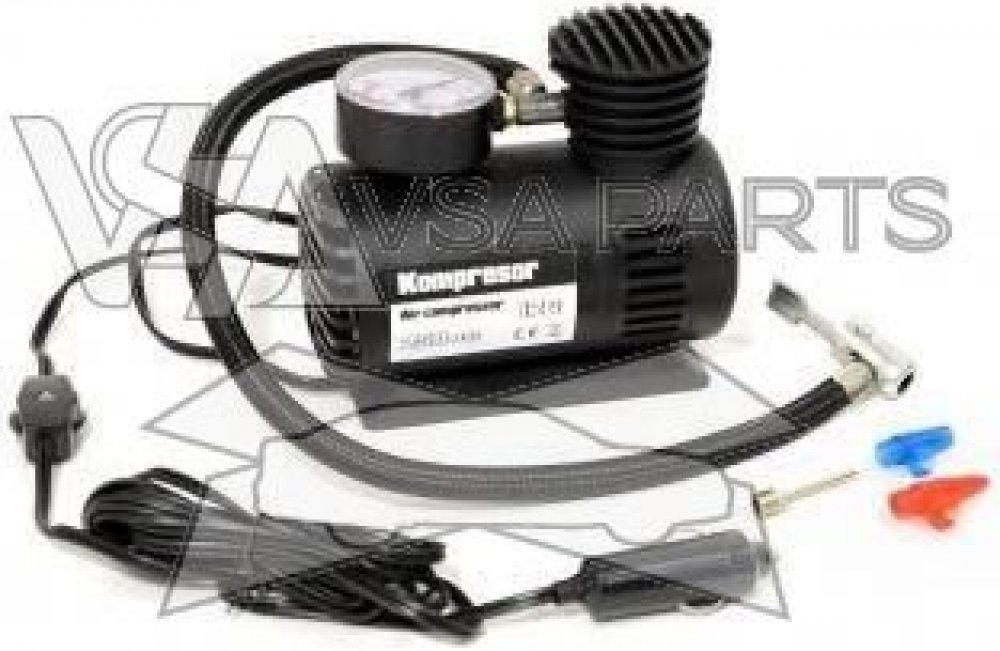 Vzduchový kompresor vybavený měřičem tlaku s celokovovým adaptérem pro klasický autoventilek. Napájení 12V, kabel se zástrčkou do zásuvky automobilového zapalovače. Součástí balení jsou přídavné adaptéry pro huštění gumových matrací, míčů apod.