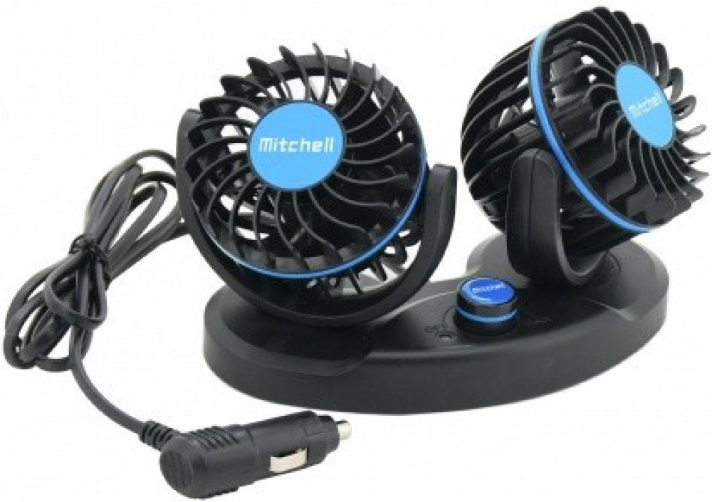Napájení 12 V ze zásuvky autozapalovače. Oba ventilátory průměru 8,5 cm lze nezávisle na sobě natočit libovolným směrem. Sestava ventilátorů se upevňuje pomocí přiložených dvou kusů lepících destiček, které zajišťují precizní a silné uchycení.