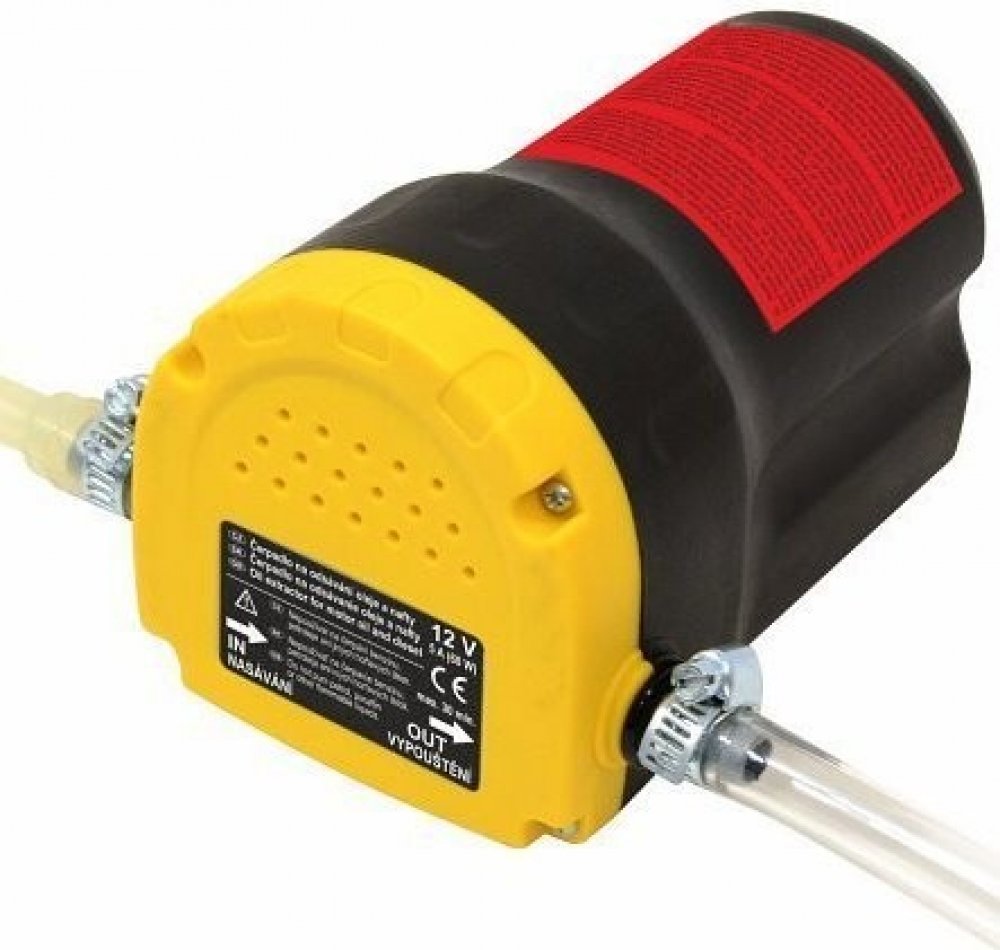 Čerpadlo určené k odsávání oleje, motorové nafty nebo lehkých topných olejů. Napájení 12V pomocí svorek, ideální k připojení na autobaterii 12V. Vhodné pro jednoduchou výměnu motorového oleje. Není nutné hledat vypouštěcí šroub oleje, stačí jen zasunout nasávací sondu do otvoru pro měrku stavu oleje (až do vnitřního průměru 6 mm) a olej vysát do připrav...