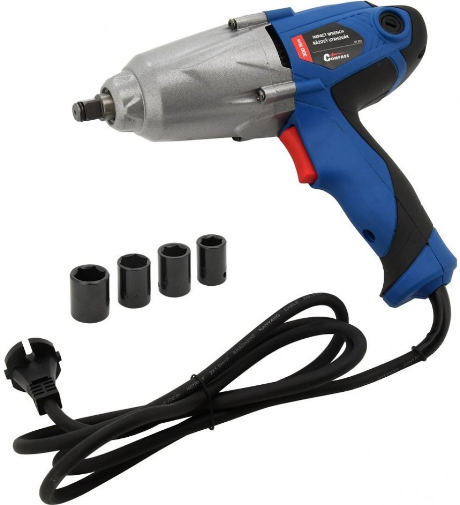 V uzavíratelném plastovém kufru obsahuje vyměnitelné nástavce z chrom-vanadiové oceli pro šrouby/matice kol 17, 19, 21 a 23 mm. Dlouhý kabel se zástrčkou do zá...