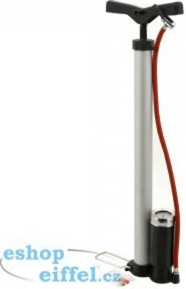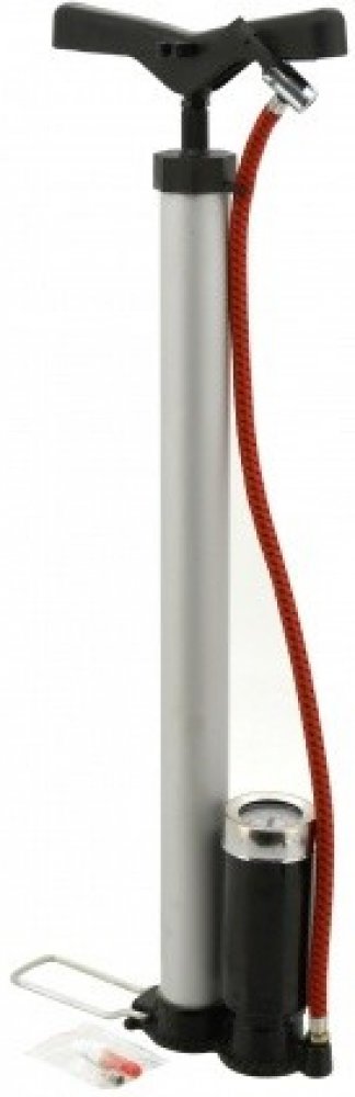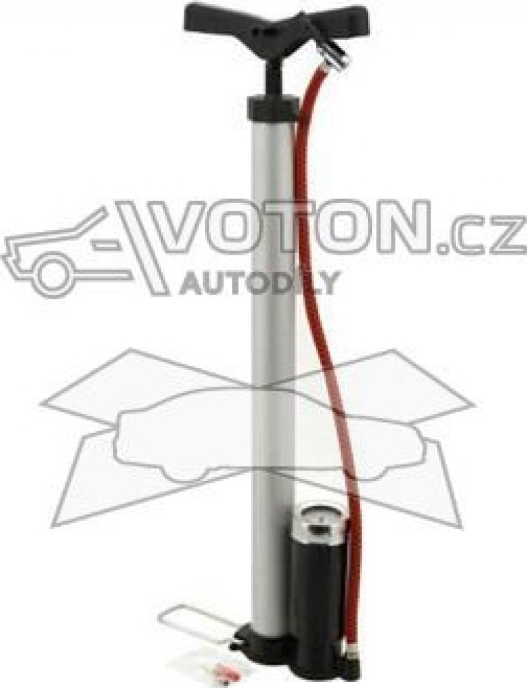 Ruční hustilka s manometrem, vhodná pro huštění pneumatik osobních automobilů, jízdních kol a dalšího příslušenství díky přiloženým adaptérům.