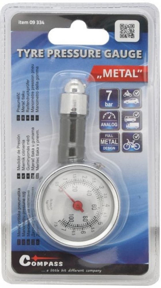 Compass pneuměřič metal 7 bar Compass pneuměřič metal 7 bar je profesionální měřič tlaku pneumatik značky Compass určený k přesnému a rychlému měření bez použití elektroniky. Popis produktu Jedná se o celokovový pneuměřič s robustní konstrukcí, která zajišťuje dlouhou životnost a odolnost vůči poškození. Měřicí rozsah se pohybuje od 0,5 do 7 Atm (atmosfér), což odpovídá tlaku...