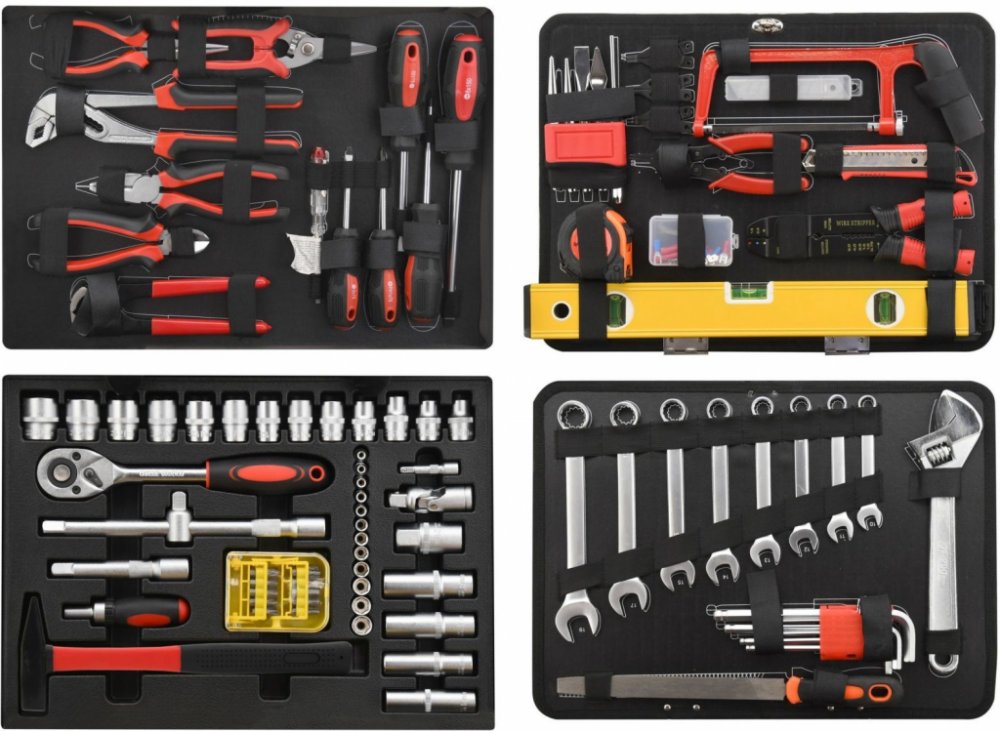 Vrchní část kufru je osazena šroubováky různých rozměrů, včetně elektrikářské zkoušečky. Dále nejběžněji používanými kleštěmi, včetně kombinovaných, štípacích a střihacích.