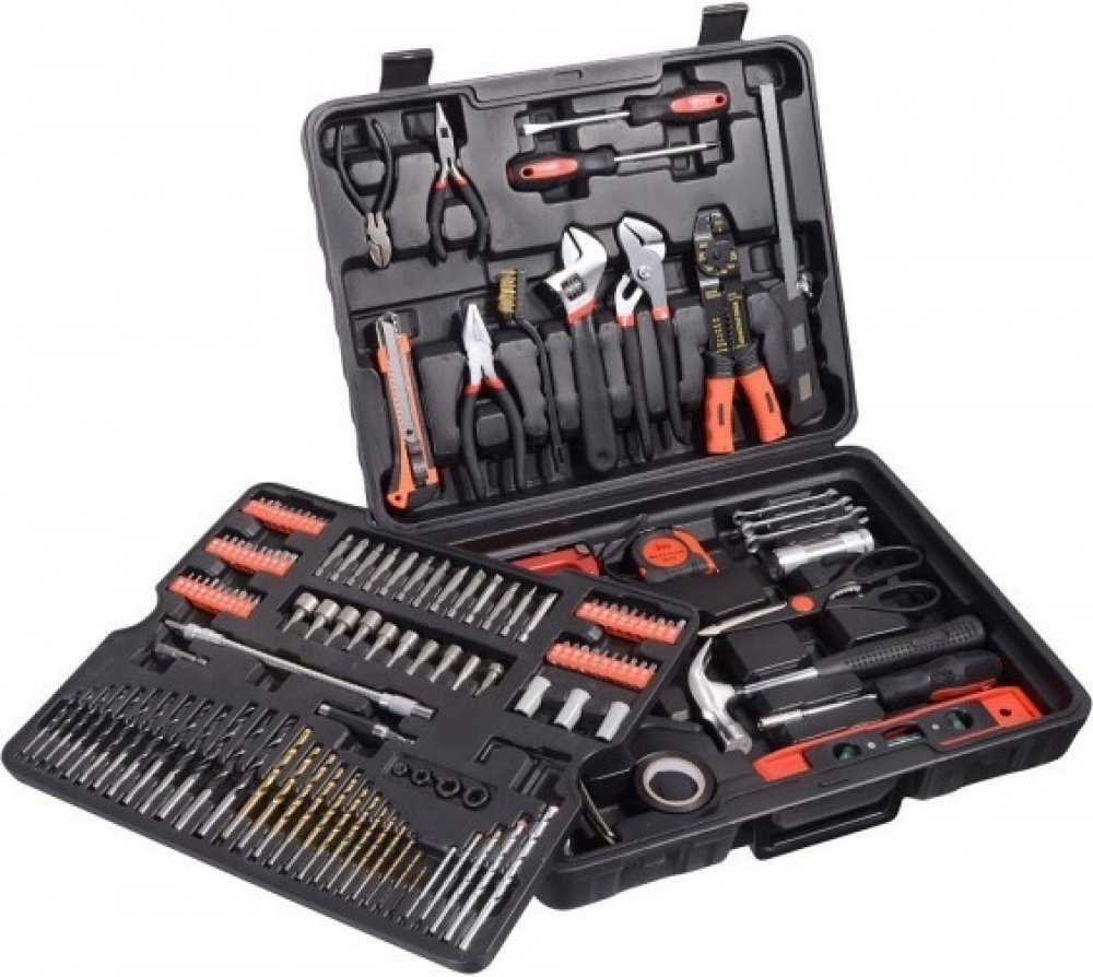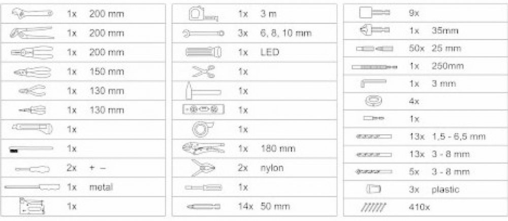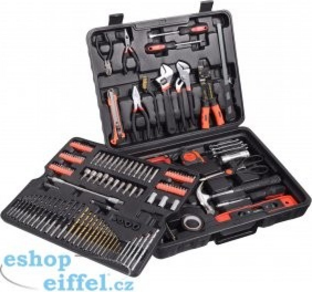 * Sada obsahuje celou řadu vrtáků, bitů, nástrčných klíčů, šroubováky, kleště, kladivo, vodováhu, stranové klíče, základní spojovací materiál a celou řadu dalšího nářadí, které je vhodné pro použití jak doma, v garáži, tak i na cestách.