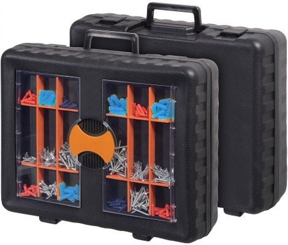 Praktický přenosný kufr s kvalitním nářadím a spojovacím materiálem obsahuje celkem 550 ks. Odolné plastové provedení.