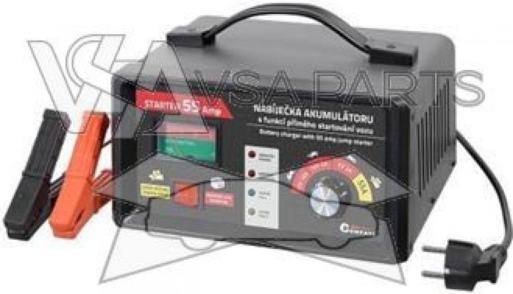Nabíječka akumulátorů s funkcí přímého startování vozu. Nabíječka akumulátorů s funkcí přímého startování vozu. Funkce STARTER 55A umožňuje nastartovat vozidlo s vybitou baterií tak, jako kdyby bylo startováno pomocí startovacích kabelů z jiného vozidla. Nabíječka umožňuje rychlé nebo pomalé nabíjení a je určena pro olověné akumulátory. Technická data: pro akumulátory: 6/12V 6 - 100 Ah jmenovitý vstup: 230V/50 Hz příkon: max 200W jmenovitý výstup: režim 12V/10A: 12 V =, 10 A (eff.) / 5,6 A (aritm.) jmenovitý výstup: režim 12V/2A: 12 V =, 3,5 A (eff.) / 2 A (aritm.) jmenovitý výstup: režim 6V/2A: 6 V =, 2,5 A (eff.) / 2 A (aritm.) jmenovitý výstup: režim 55A: 12 V =, 55 A typ nabíjení : automatické pro akumulátory: olověné (Pb) (Lead-acid Battery) provozní teplota: -5° C až + 40° C