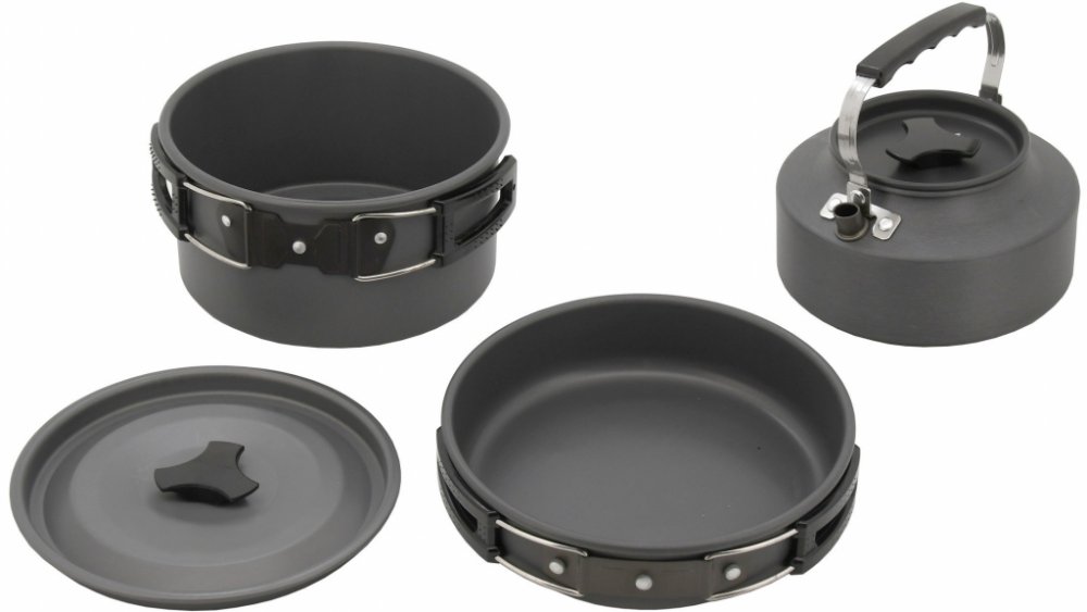 Sada na vaření z anodizovaného hliníku je vhodná při turistických a dalších outdoorových aktivitách, kde je třeba skloubit komfort, skladnost a váhu. Je tvořena pánvičkou o rozměrech 18 x 4 cm, kotlíkem s rozměry 17 x 9 cm s pokličkou a konvicí s rozměry 15 x 7,5 cm. Sada Tripple má rozměry nádob odstupňované tak, aby je bylo možné zasunout do sebe, čímž ušetří spoustu místa. Navíc jsou všechny nádoby opatřeny sklápěcími držátky s plastovými konci, pro maximální komfort při vaření. Dodáváno v látkovém obalu.