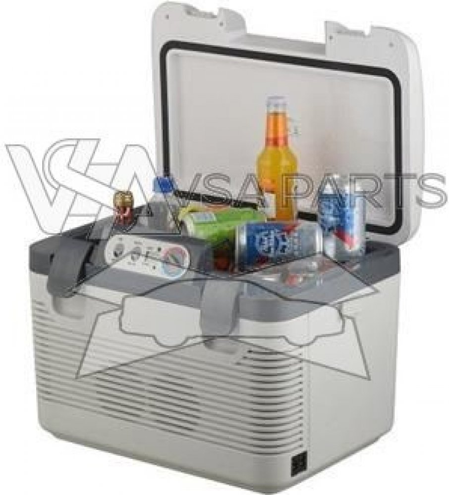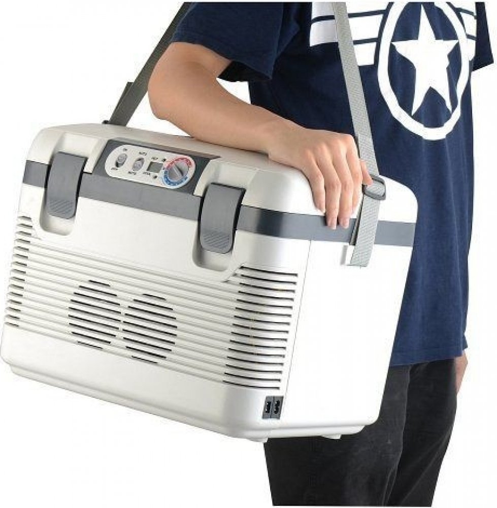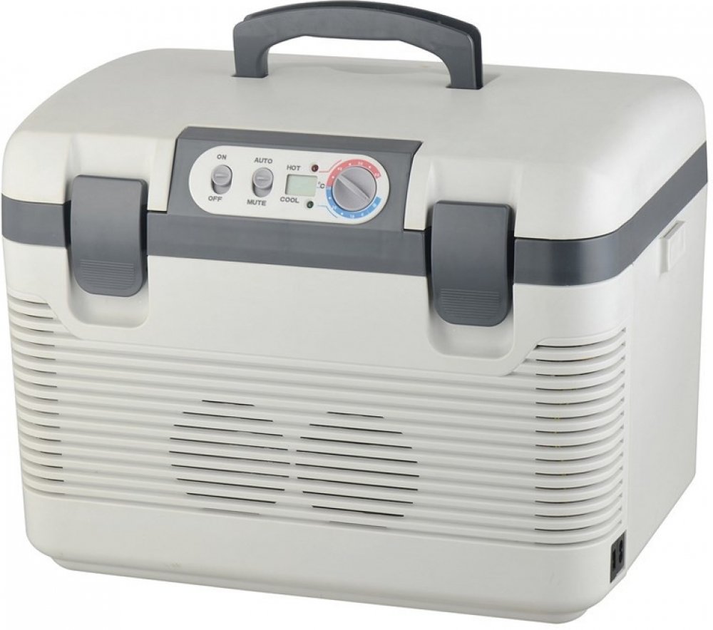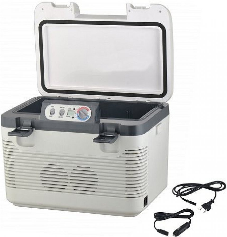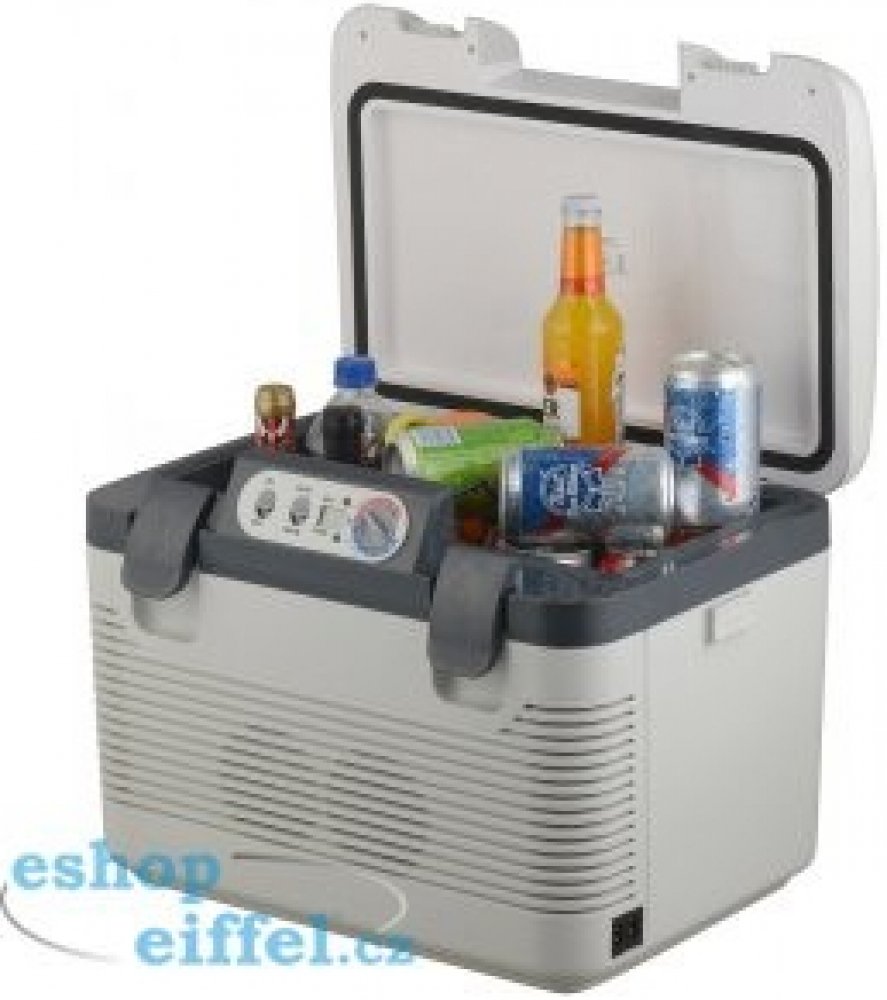 Přenosný chladicí box s možností ohřevu, napájení ze zásuvky autozapalovače 12 V nebo 24 V a také z běžné zásuvky 230 V, vnitřní objem 19 litrů.