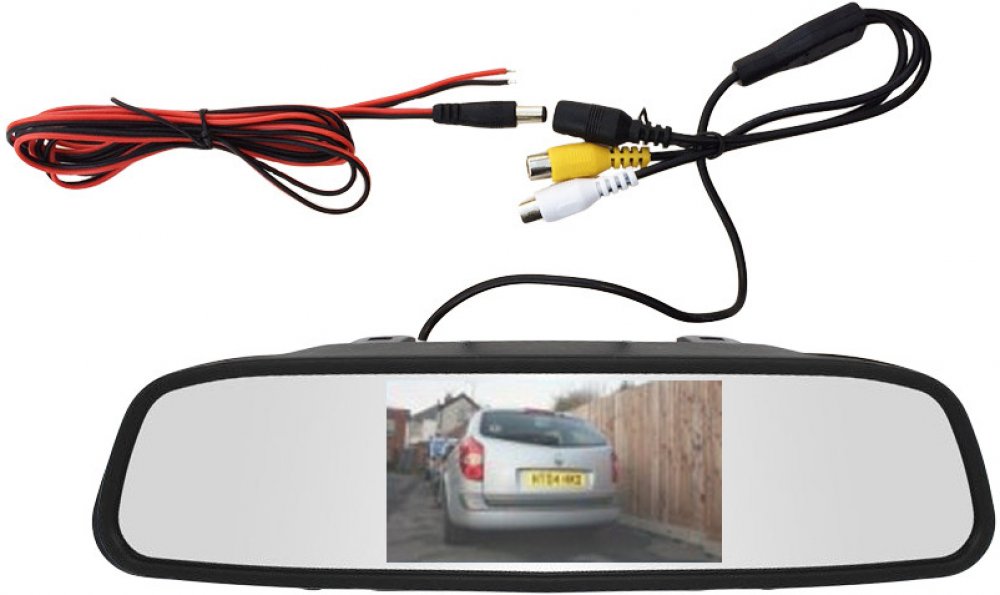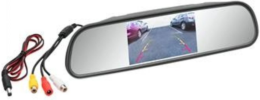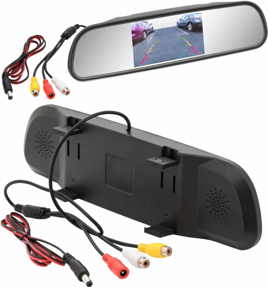 * Přídavné zrcátko se zabudovaným LCD displejem, ideální pro použití s parkovací kamerou i k přehrávání NTSC/PAL videí z jakéhokoliv přehrávače s výstupním Cinch (RCA) kabelem.