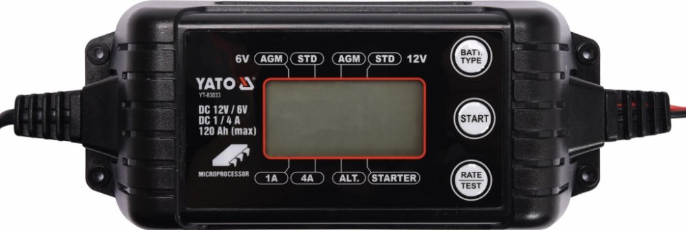 6 V a 12 V - pro gelové, zaplavené (PbWet) baterie, nabíjecí proud od 1 do 4 A, maximální kapacita nabíjené baterie 120 Ah, minimální napětí napájené baterie 9 V, ochrana proti přebíjení, udržovací nabíjení, mikroprocesorové řízení, rozměry 4,5 × 8 × 17,5 cm (V׊×D), hmotnost 0,64 kg, délka síťového kabelu 1,6 m, délka nabíjecího kabelu 1,6 m, krokosvorky v balení (YT-83033)