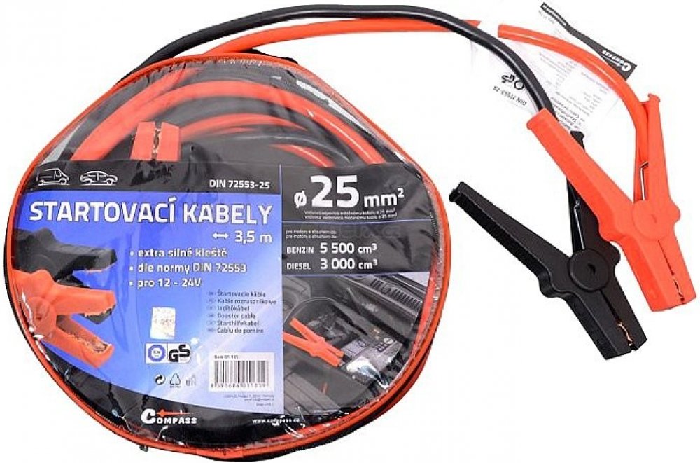 Tyto startovací kabely jsou určeny pro nouzové startování vozidel s benzinovým motorem do objemu 5500 cm? nebo s naftovým motorem do 3000 cm?. Délka 3,5 metru, vodivostí odpovídá měděnému kabelu o průměru 25 mm?.