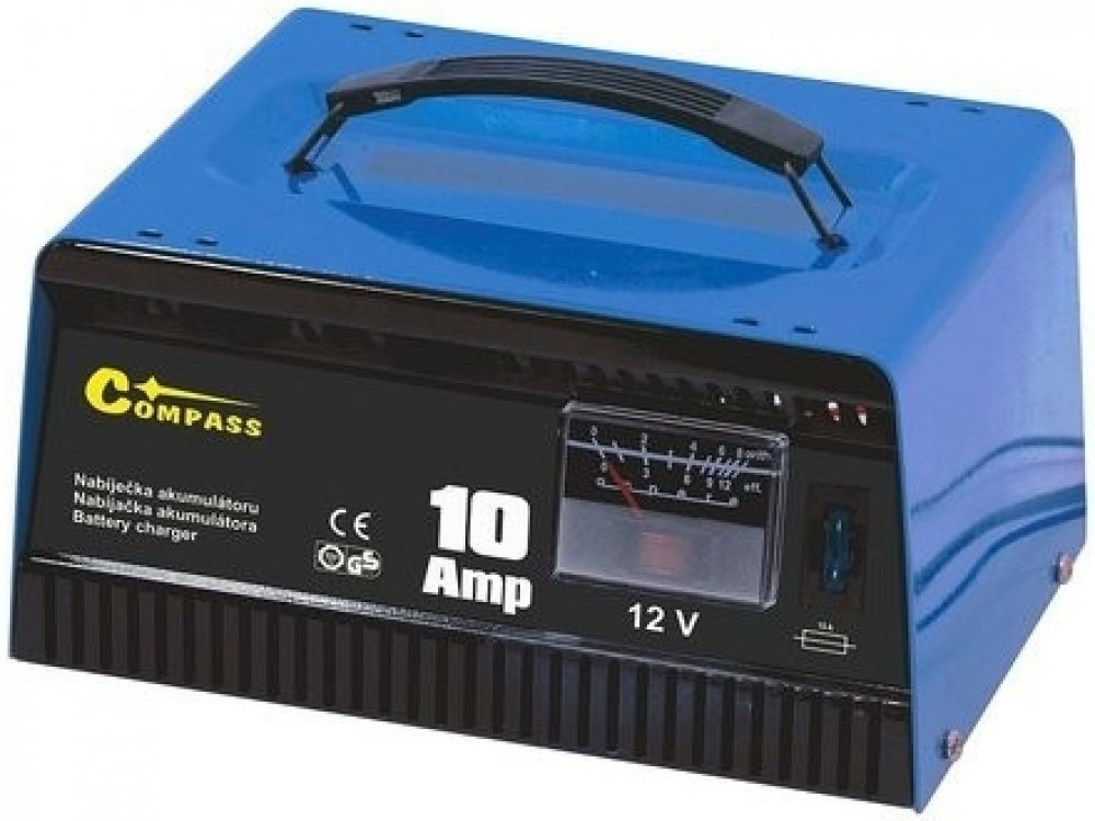 Celokovová automatická nabíječka akumulátorů 12V 10 Amp. Napájení 230V, příkon 134W. Tato nabíječka je určená k nabíjení bezúdržbových olověných akumulátorů o kapacitě 5 - 100 Ah. Nabíječka je na čelní straně osazena ampérmetrem ukazujícím aktuální nabíjecí proud a pojistkou.