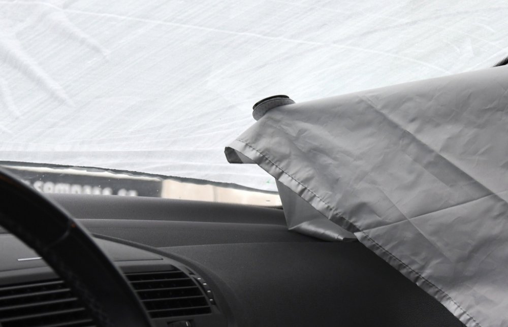 Instalace je snadná a rychlá, clona se umístí zvenku na čelní sklo a okolo sloupků se okraje provléknou dovnitř vozu. Pomocí přísavek se upevní na vnitřní stranu okna a nakonec se ještě zajistí přivřením dveří řidiče i spolujezdce. To má za výhodu, že i při silném větru clona vydrží na svém místě.