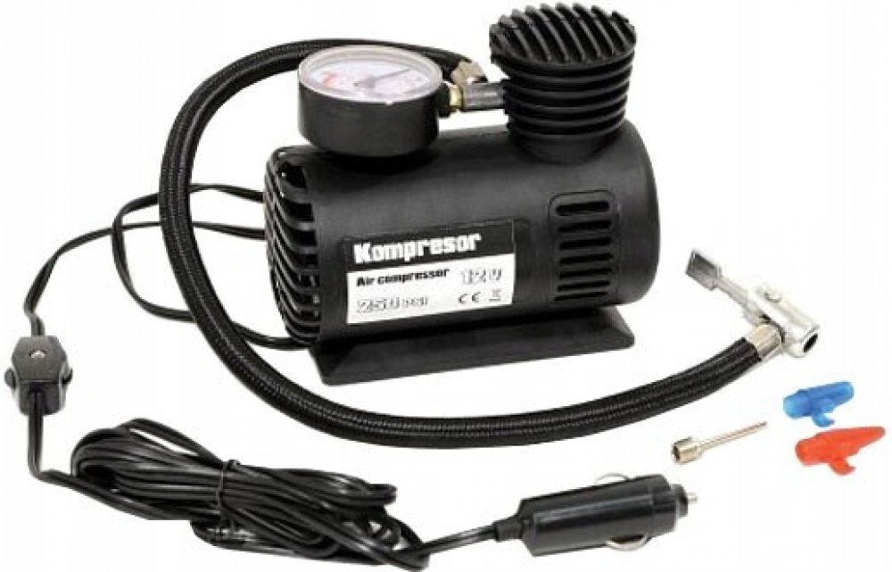Vzduchový kompresor vybavený měřičem tlaku s celokovovým adaptérem pro klasický autoventilek. Napájení 12V, kabel se zástrčkou do zásuvky automobilového zapalovače. Součástí balení jsou přídavné adaptéry pro huštění gumových matrací, míčů apod.