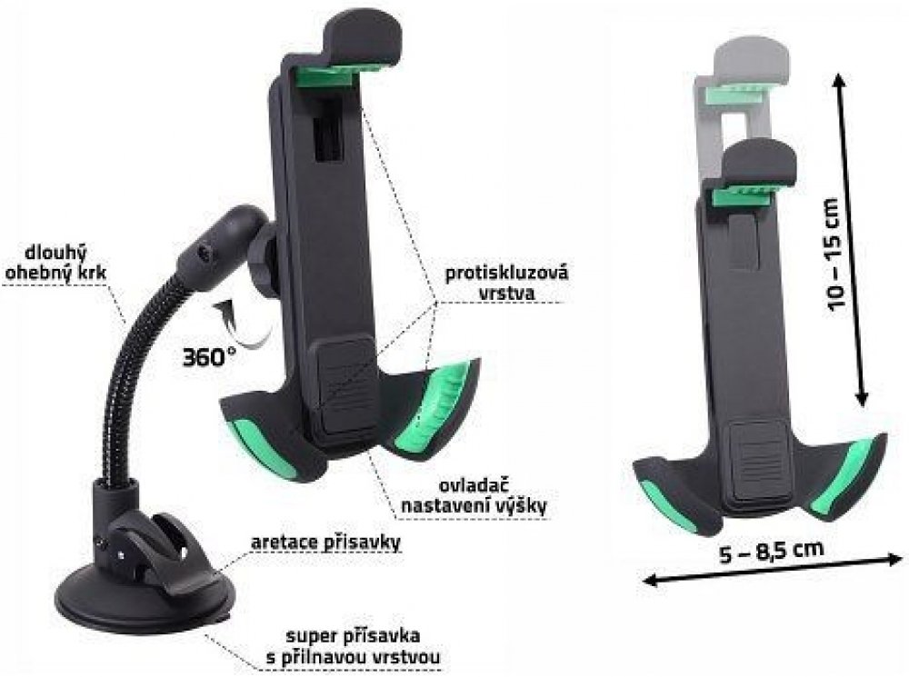 Držák telefonu s extra silnou přísavkou a ohebným ramenem, pro uchycení telefonu či navigace (až do 15 cm).