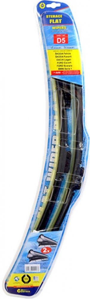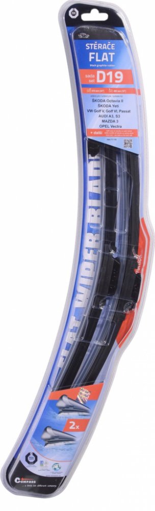 Komplet se skládá ze dvou plochých stěračů FLAT (řidič + spolujezdec) se speciálním uchycením. Součásti balení jsou i adaptéry pro různá zakončení ramen stěračů. Vysoce kvalitní pružný člen plochého stěrače zajišťuje stejnoměrný tlak grafitového břitu v celé jeho délce, což zamezuje rozmazávání nečistot a vytváření pruhů.Tento typ plochého stěrače je osazen gumičkou s černým grafitem, umožňuje i její výměnu. Délky stěračů a adaptéry pro uchycení na rameno stěrače jsou přizpůsobeny vybraným vozům. Tabulka použití sad stěračů FLAT DOUBLE blister vhodné např. pro vozy: ŠKODA Octavia II ŠKODA Yeti VW Golf V, Golf VI, Passat AUDI A3, S3 MAZDA 3 OPEL Vectra Tabulka použití ke stažení ZDE