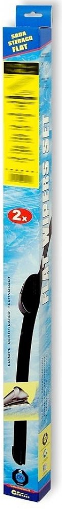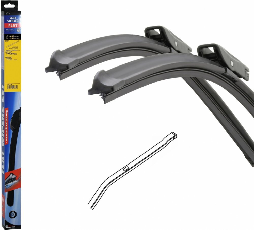 Sada dvou plochých stěračů FLAT (řidič + spolujezdec) se speciálním uchycením. Délky stěračů a systém uchycení na ramínko jsou přizpůsobeny vybraným vozům (viz tabulka použití).