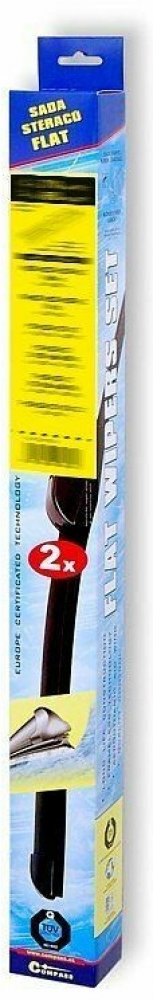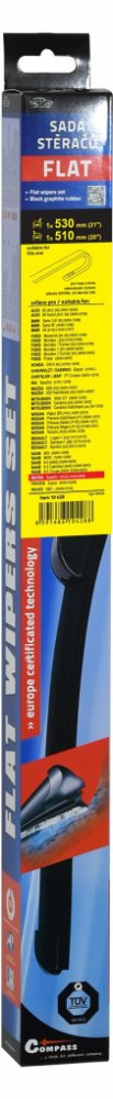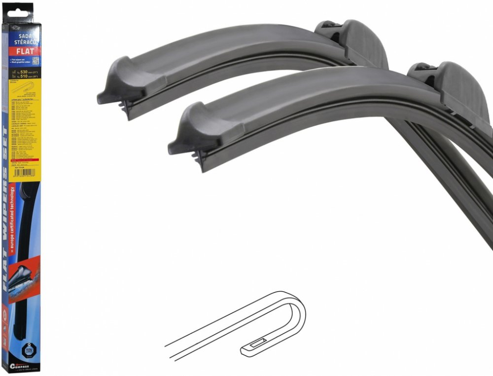 Sada dvou plochých stěračů FLAT (řidič + spolujezdec) se speciálním uchycením. Délky stěračů a systém uchycení na ramínko jsou přizpůsobeny vybraným vozům (viz tabulka použití).