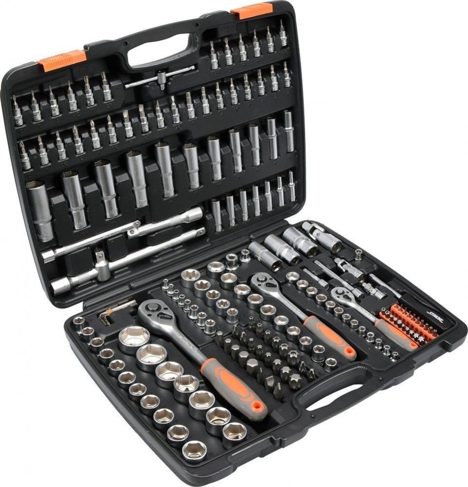 Kvalitní gola sada z nástrojové oceli v praktickém přenosném kufříku.Sada obsahuje tři ráčny, celou řadu bitů, adaptérů a nástavců, vše přehledně uspořádáno v přehledných pozicích.Plynulý chod zajišťuje ráčnový mechanizmus se 45 zuby. Klíče jsou vybaveny systémem As-Drive, vnitřní profil je tvarován do mírného obloučku, při záběru tak síla působí celou plochou, což snižuje opotřebení šroubu a pomáhá při demontáži již poškozených šroubů.Sada je vhodná pro použití jak doma, tak v garáži, i na cestách. Obsah sady 18x nástavec 1/2: 10 11 12 13 14 15 16 17 18 19 20 21 22 23 24 27 30 32 mm 5x nástavec dlouhý 1/2: 16 17 18 19 22 mm 3x nástavec Torx 1/2: E18 E20 E24 10x nástavec 3/8: 10 11 12 13 14 15 16 17 18 19 mm 6x Konkurenční objednací čísla: TO-58688 COMPASS TO-58688 nezařazený díl COMPASS