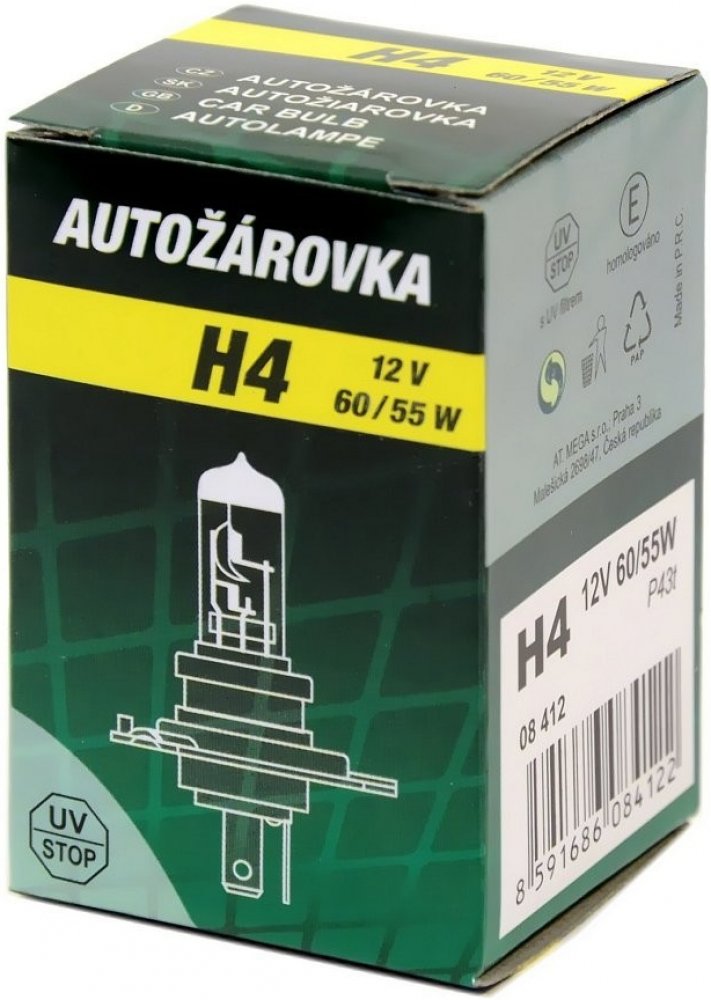 Halogenová autožárovka 12V, homologace E. Sklo žárovky s UV filtrem - žárovka je vhodná pro všechny druhy světlometů.