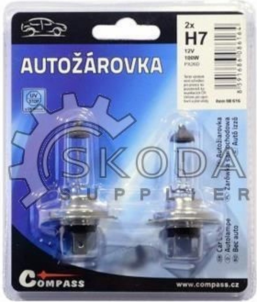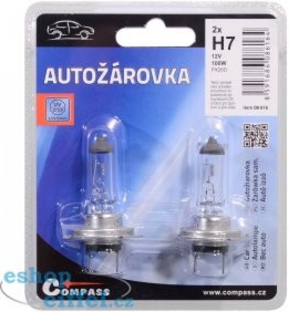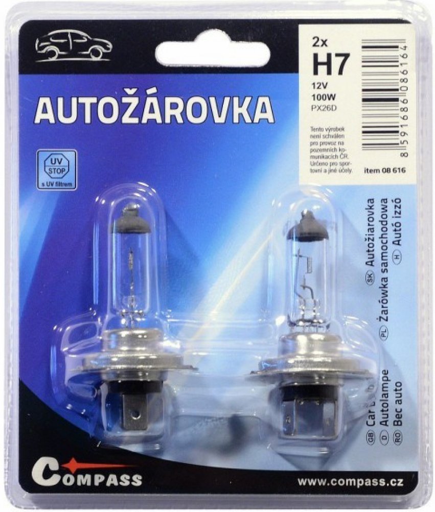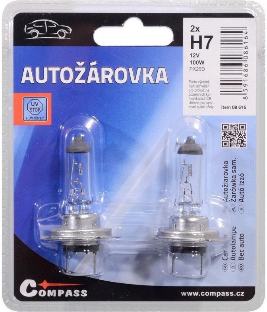 Autožárovka Compass 08616 12V H7 100W PX26d 2ksHalogenová autožárovka 12V, sklo žárovky s UV filtrem. Balení blisterů 2 ks. Tento výrobek není schválen pro provoz na pozemních komunikacích ČR. Určeno pro sportovní a jiné účely.technická data: typ žárovky H7napětí 12 Vpříkon 100Wpatice PX26dUV filtr anosada 2 ks