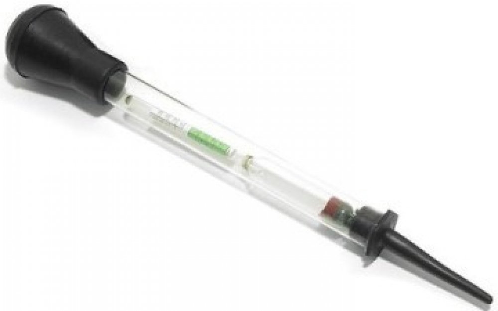 Skleněný hustoměr s balónkem, nasávací trubicí a vnitřním plovákem, určený k měření náplně chladiče automobilu.