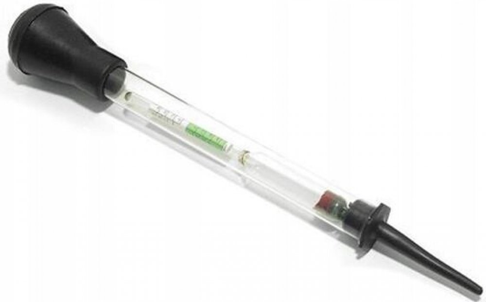 Hustoměr chladící kapaliny Skleněný hustoměr s balónkem, nasávací trubicí a vnitřním plovákem, určený k měření náplně chladiče automobilu. Technické údaje: Hmotnost: 0,069 kg Objem: 0,000929 m3 (= 0,929 litrů)