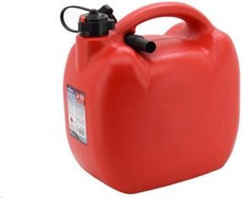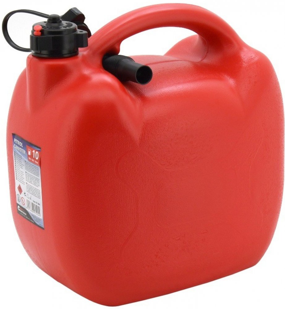 Produkt je vytvořen z odolného plastu červené barvy, s ergonomicky tvarovaným madlem na vrchní části kanystru.