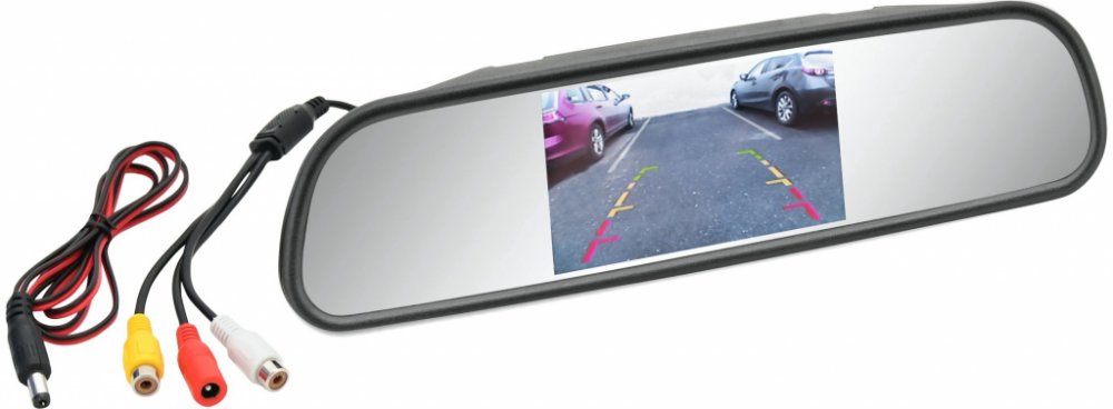 Přídavné zrcátko se zabudovaným LCD displejem, ideální pro použití s parkovací kamerou i k přehrávání NTSC/PAL videí z jakéhokoliv přehrávače s výstupním Cinch (RCA) kabelem.