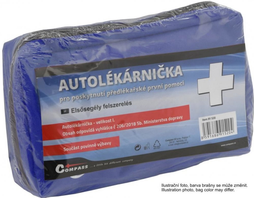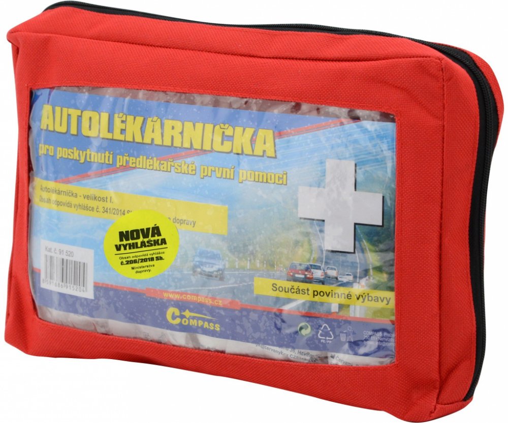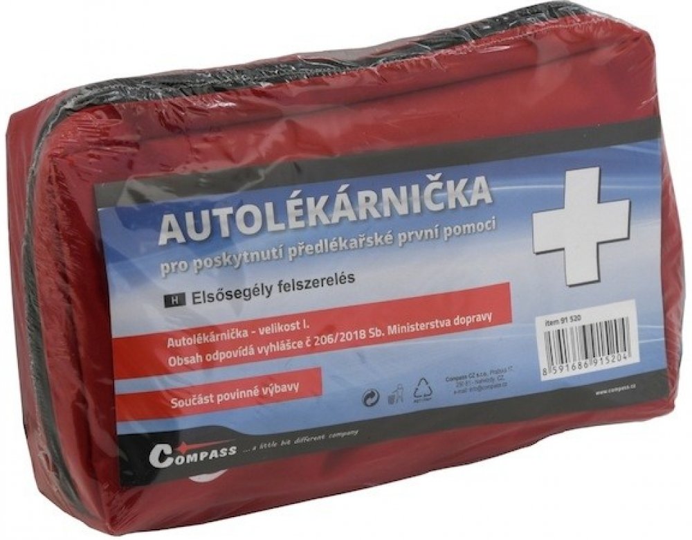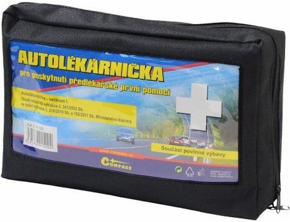 Compass - Compass Lékárnička I. textilní brašna 91520 z kategorie Dílna | Autodoplňky | Výbava, příslušenství | Povinná výbava od výrobce Compass Autolékárnička velikost I. v provedení textilní uzavíratelná brašna. Velikost brašny 25 x 16 x 5 cm. Autolékárnička je součástí povinné výbavy automobilů. Autolékárnička podle vyhlášky č. 341/2002 Sb., ve znění vyhlášky č. 216/2010 Sb. a vyhlášky 182/201...