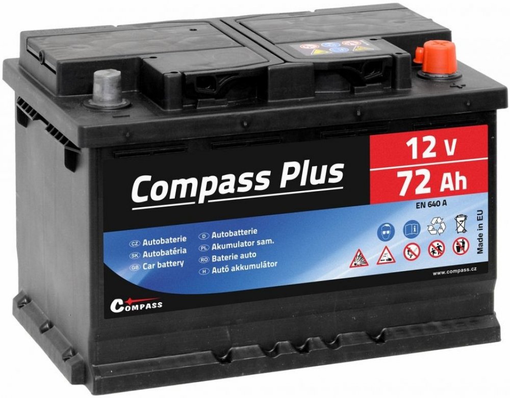 12 V 640 A Compass 17.1 kg (+) pól vpravo 72 Ah Ca/Ca B13 190 mm 175 mm 278 mm am27564 EN pro osobní vozy vhodné pro domácí montáž (DIY) s horními póly (top post)