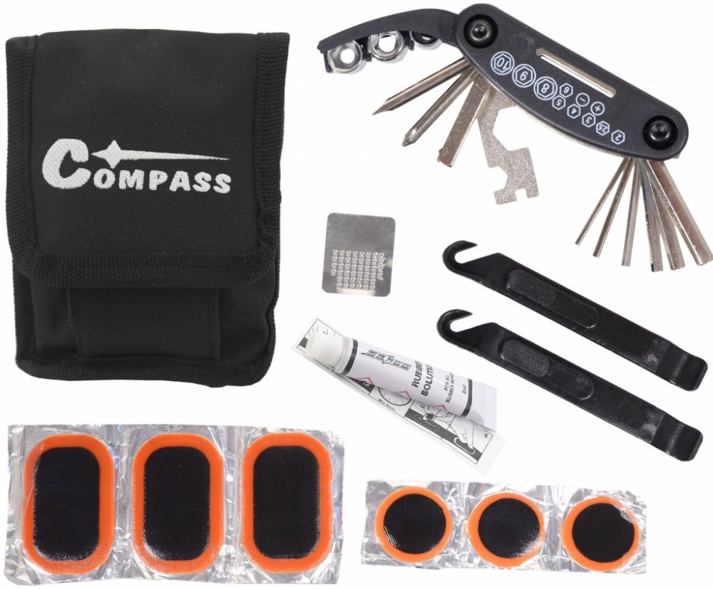 Uzavíratelné textilní pouzdro Compass Bike 12076 zahrnuje multifunkční soupravu cyklistického nářadí pro rychlou opravu či výměnu
