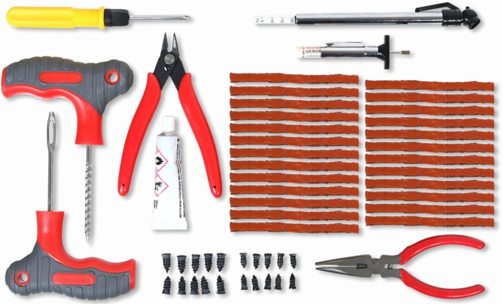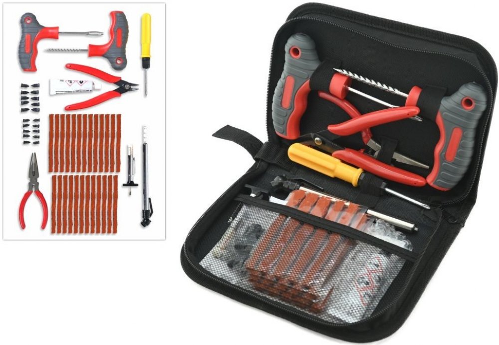 1x Průtažník s T-rukojetí 1x Vidlice s T-rukojetí 1x Měřič tlaku v pneumatikách 1x Měřič hloubky dezénu pneumatiky 25x Opravné knoty 2x Kleště 20x Vulkanizační šrouby 1x Šroubovák 1x Vulkanizační lepidlo