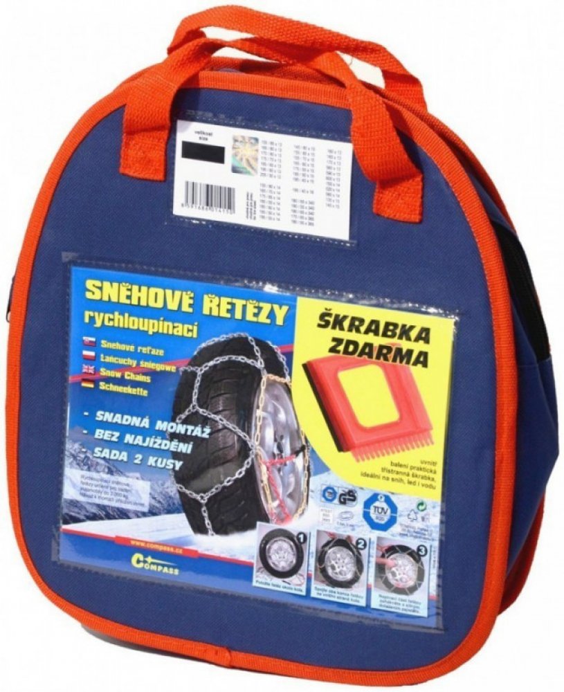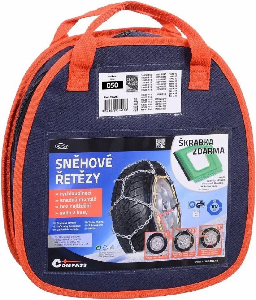 Vhodné jsou pro rozměr pneumatiky, uvedené v titulku produktu (šířka / profil / průměr v palcích). Sněhové řetězy Compass budete mít zabaleny v praktické uzavíratelné textilní tašce ze silného materiálu.