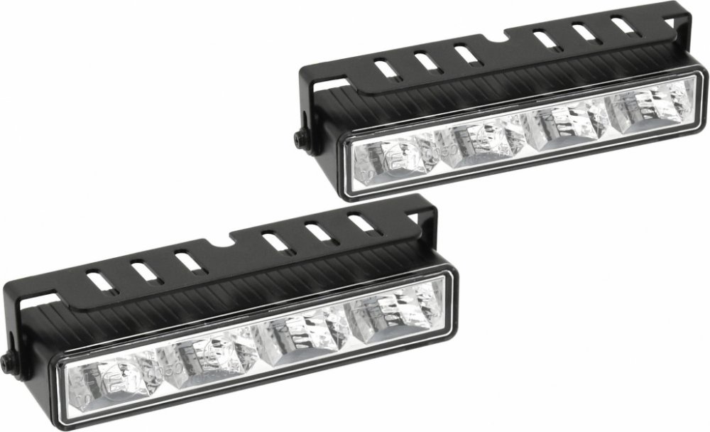 Homologovaná světla pro denní svícení, napájení 12/24 V. Každé světlo je osazeno 4x vysoce svítivou HI POWER LED diodou.