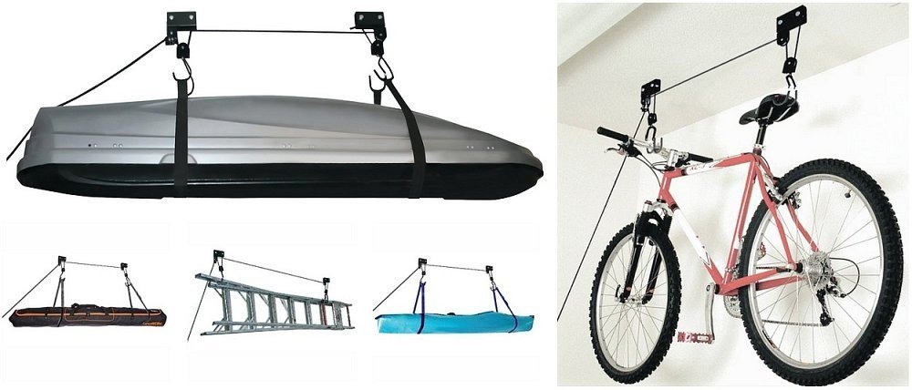 Držák funguje na principu kladkostroje a dokáže snadno zvednout střešní boxy, žebříky, lyže, jízdní kola, kajaky a další obdobné rozměrné předměty až do váhy 52 kg a umístit je pod strop místnosti s maximální výškou 4 m.