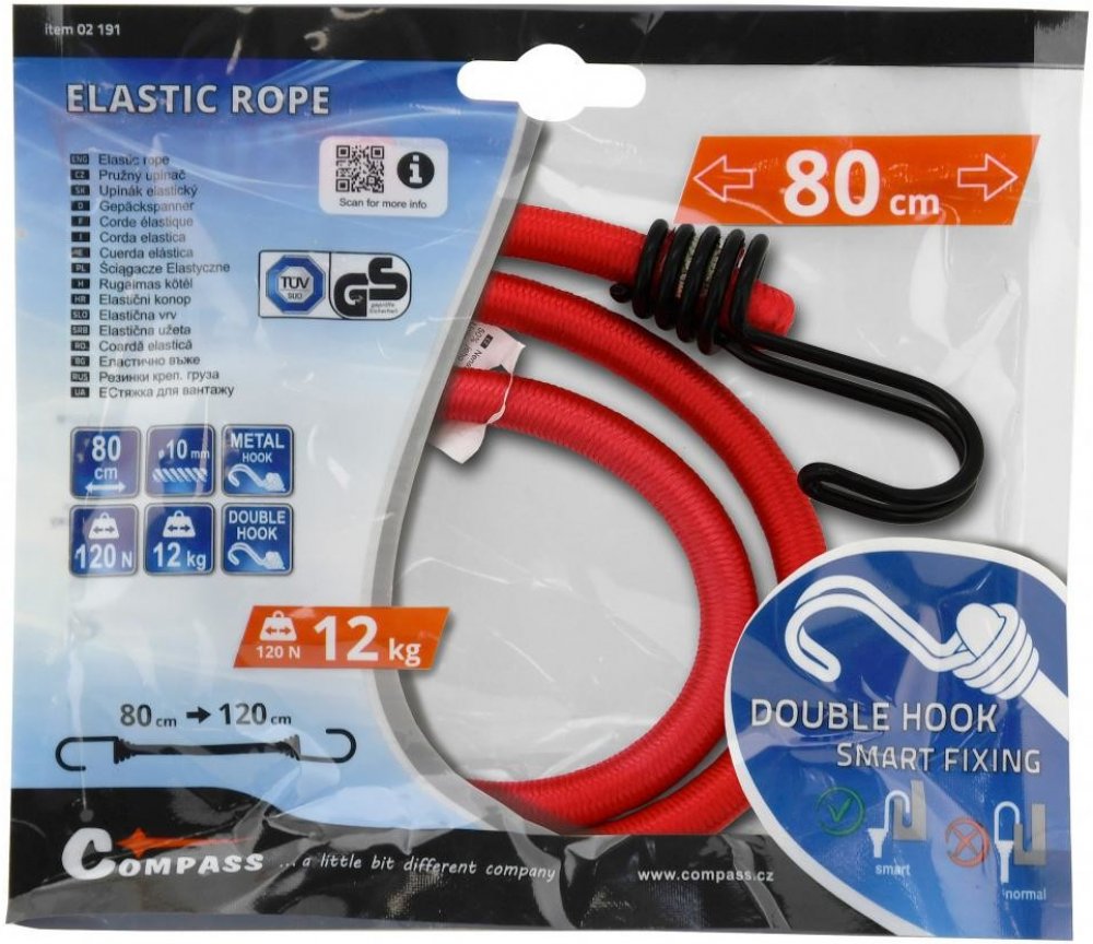 Technická data délka 80 cm průžez 10 mm hák 2x zdvojený, kovový pevnost v tahu 120Nbalení 1ks barva červenáhomologace TÜV/GS